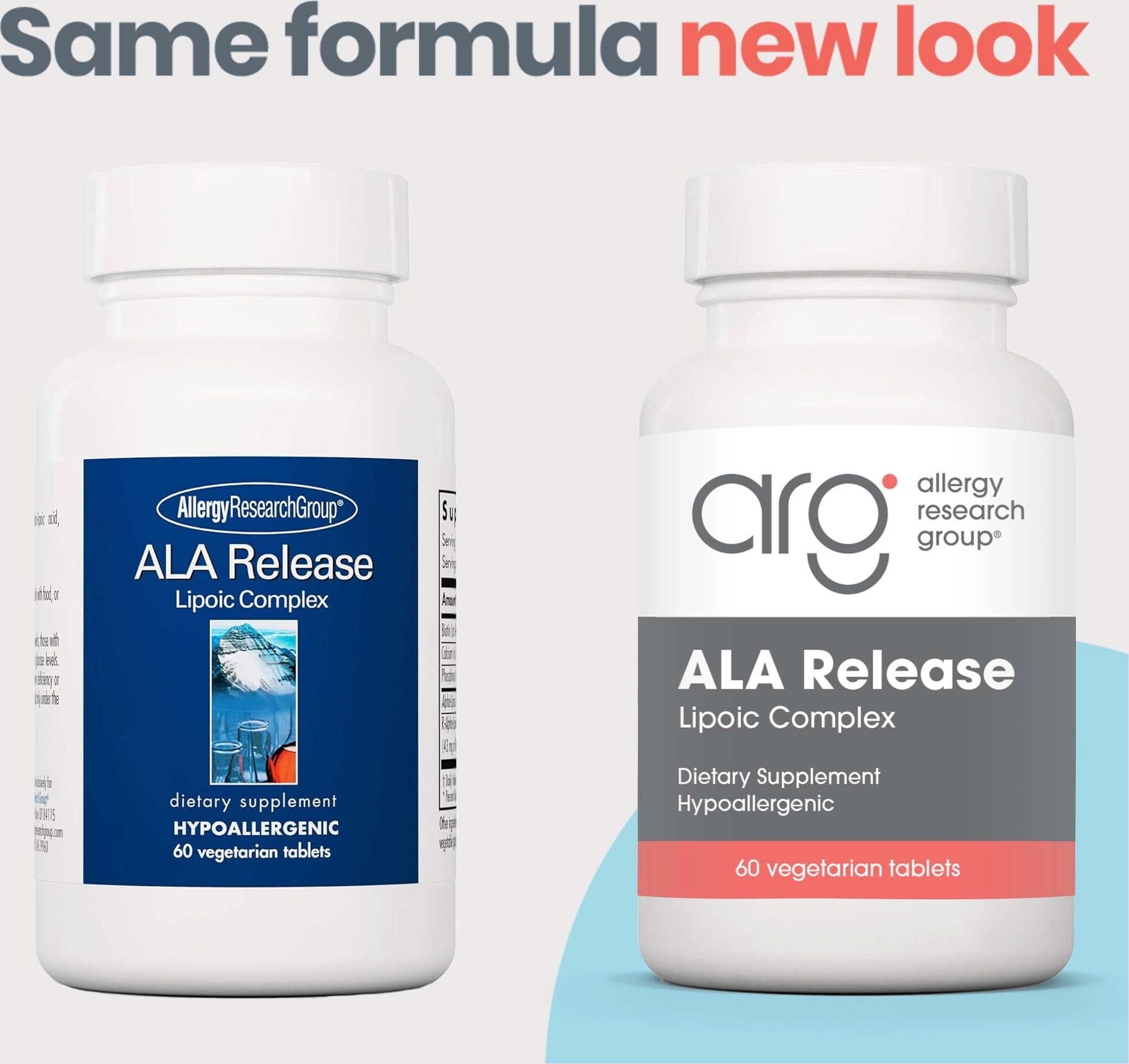 Allergy Research Groupin ALA Release sisältää alfalipoonihappoa, R-alfalipoonihappoa, biotiinia ja kalsiumia.