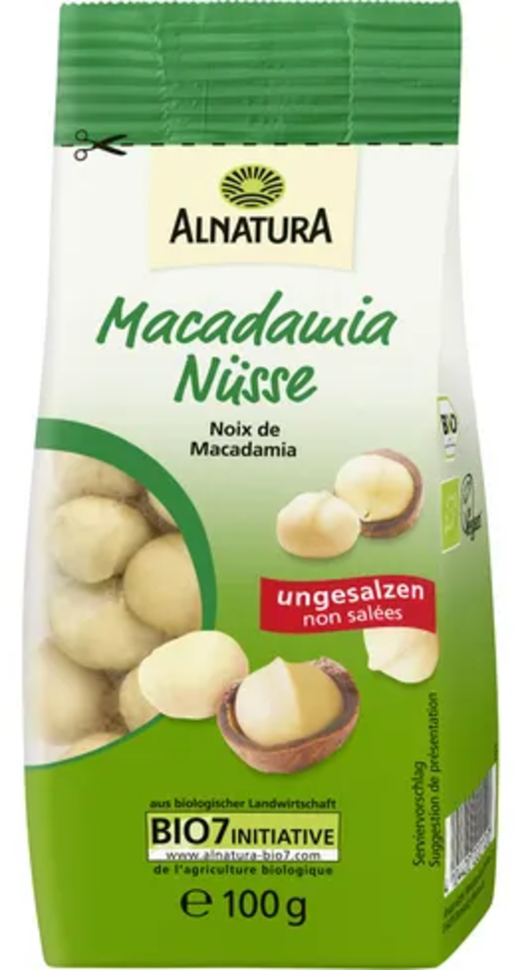 Alnaturan luomu macadamiapähkinät ovat kuorittuja ja suolattomia. Niiden miedosti voinen maku tekee niistä erinomaisen välipalan tai käytettäväksi leivonnassa sekä myslin tai jälkiruokien koristeena.