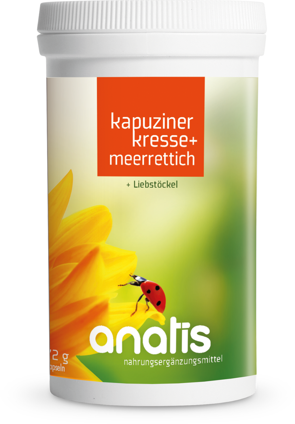 Meerrettichwurzel Pulver, Kapuzinerkresse Pulver, koristekrassi (Tropaeolum majus), Liebstöckelwurzel Pulver, Hydroxypropylmethylcellulose (Kapselhülle)