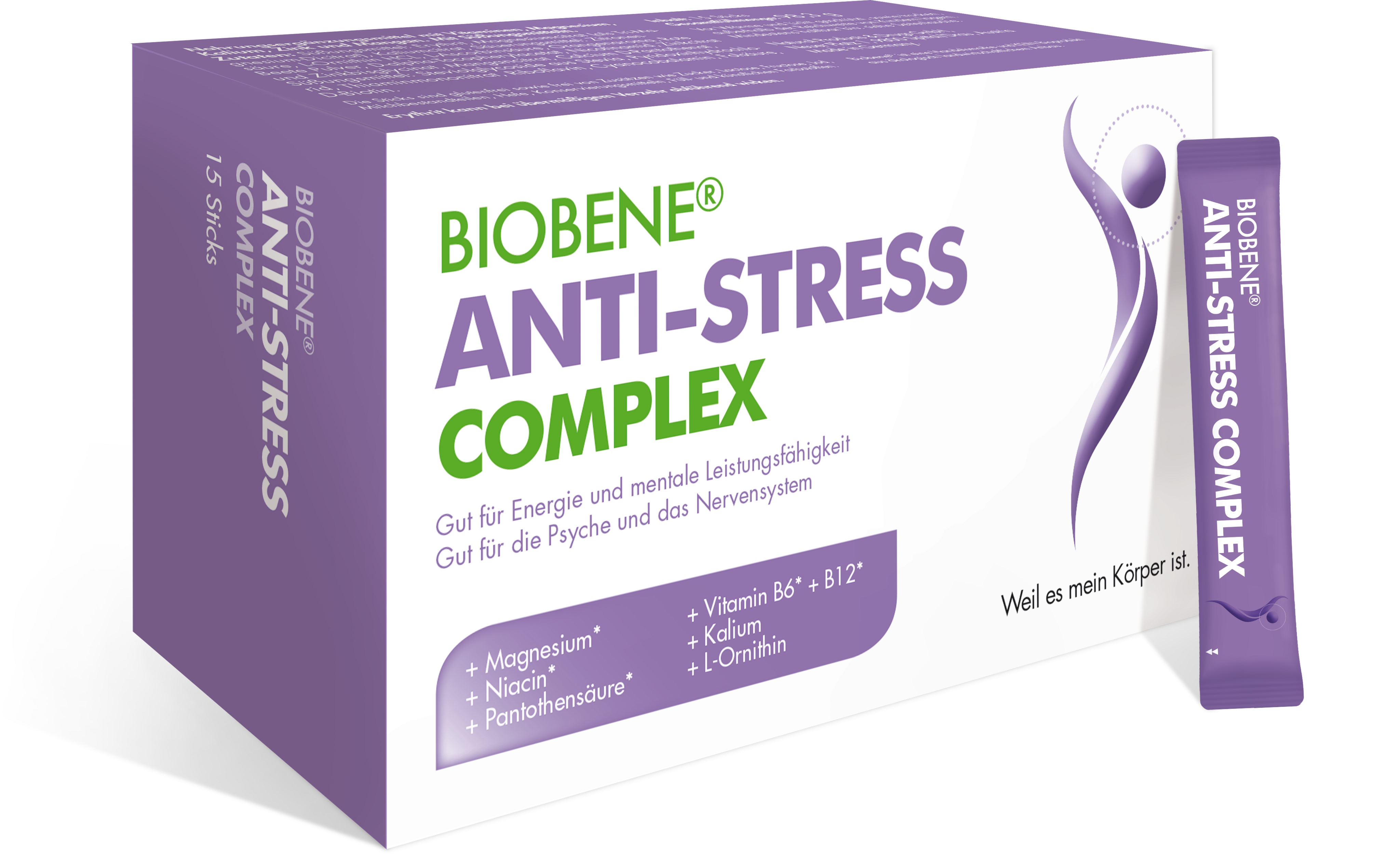 BIOBENE® Anti-Stress Complex sisältää magnesiumia, kaliumia, C-vitamiinia, E-vitamiinia, B-vitamiineja ja sinkkiä – kätevissä tikuissa, jotka tekevät päivittäisestä käytöstä vaivatonta.