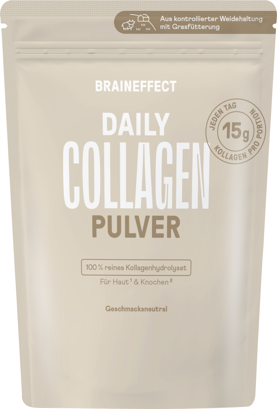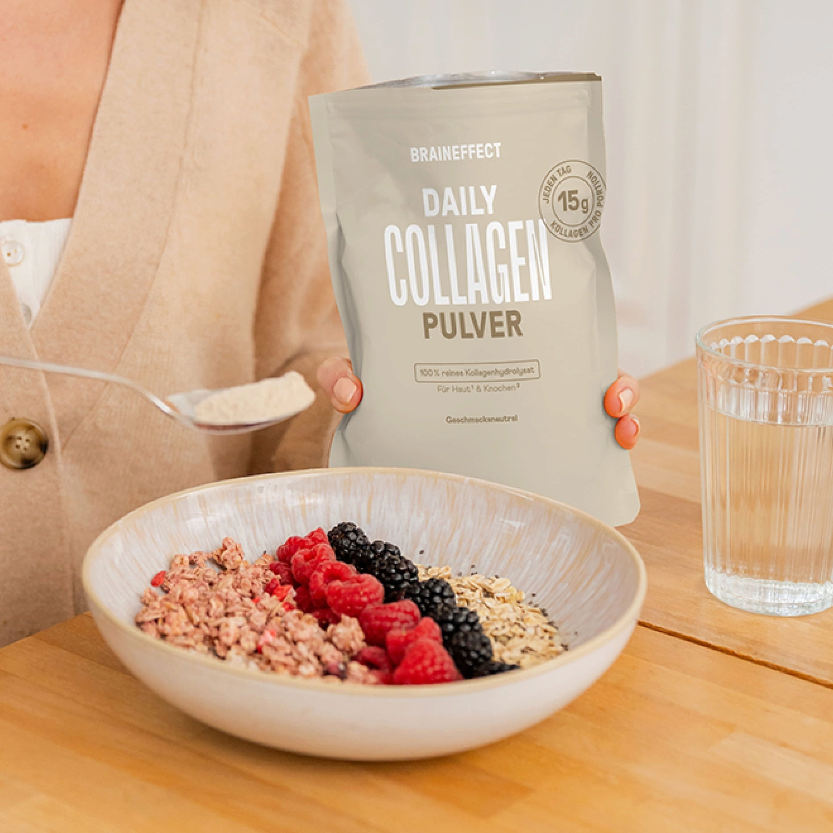 Daily Collagen Powder, joka sisältää 15 g hydrolysoitua kollageenia, on ihanteellinen päivän aloitukseen. Täysin ilman häiritsevää jälkihajua ja -makua.