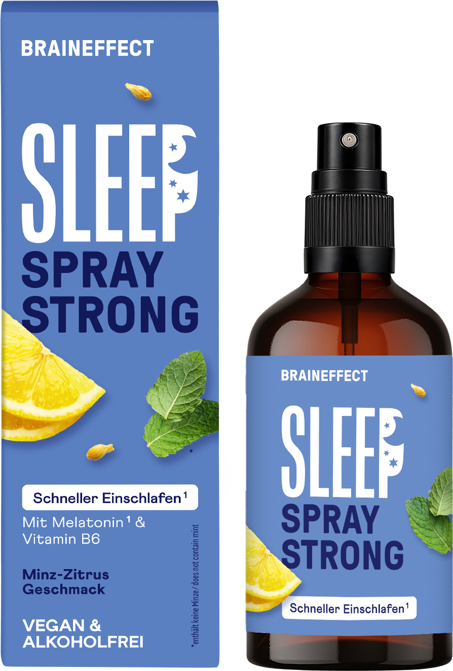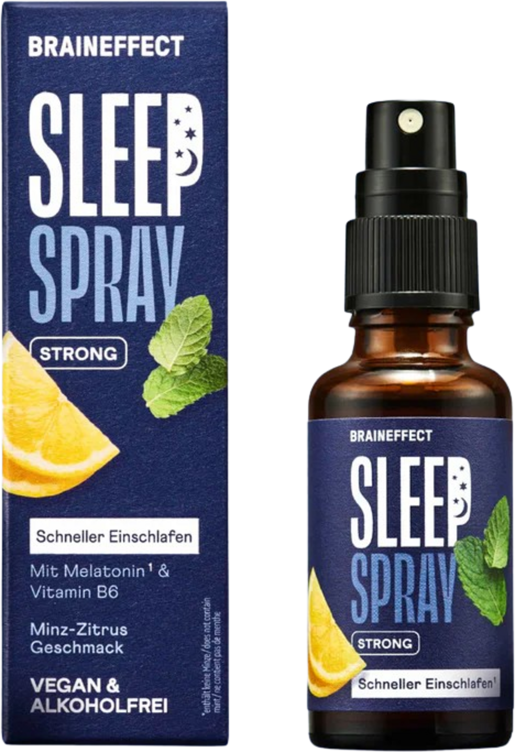 BRAINEFFECT Sleep Spray Strong on suun kautta käytettävä suihke, joka sisältää selkeästi määritellyn yhdistelmän melatoniinia, B6-vitamiinia ja valittuja kasviuutteita, kuten laventelia ja ashwagandhaa. Päivittäinen annos (4 suihkausta) sisältää yhteensä 2 mg melatoniinia, luonnollista ainetta, joka voi lyhentää nukahtamisaikaa ja lisäksi lievittää subjektiivisia aikaerorasituksen tuntemuksia.