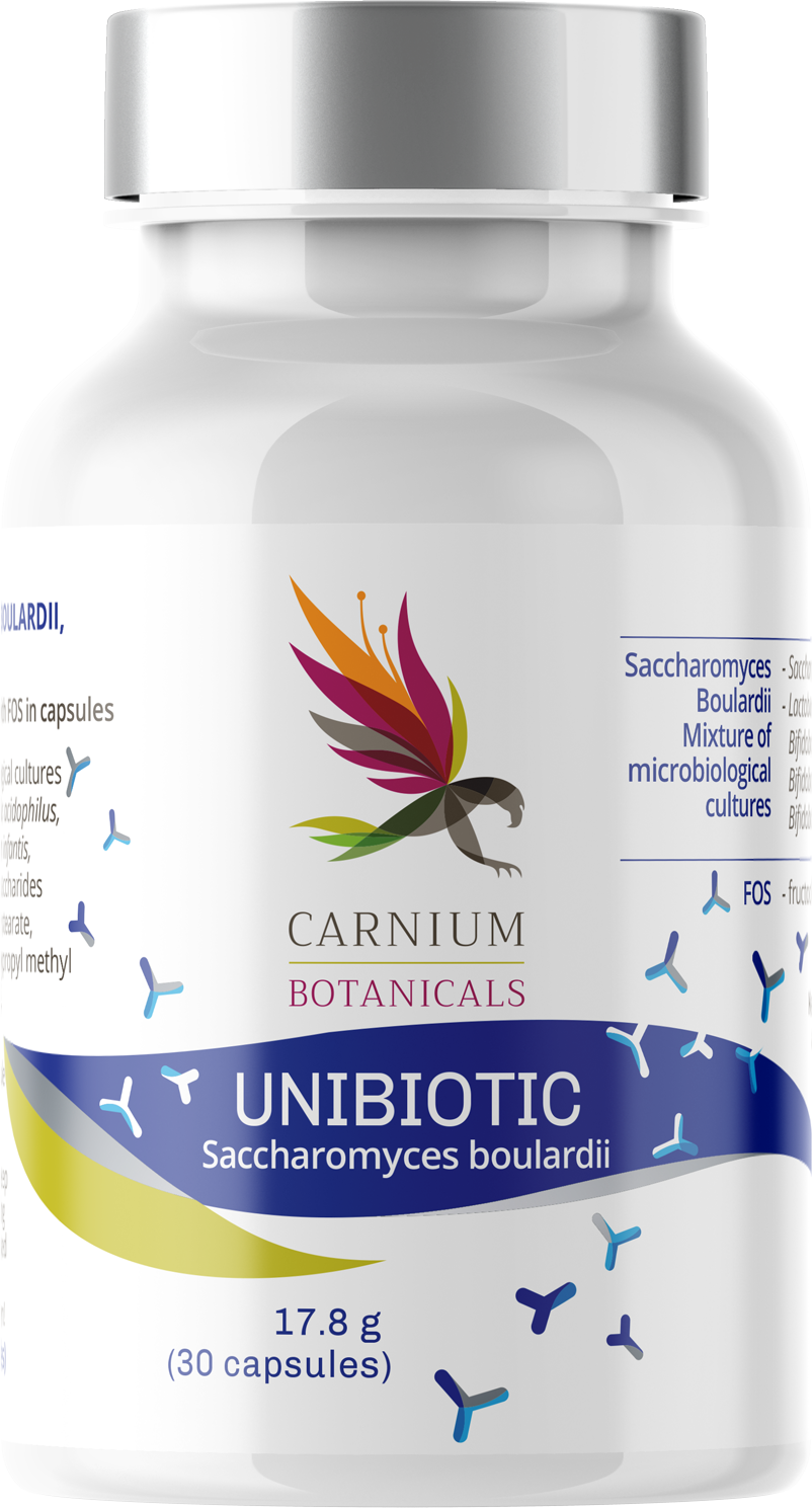 Carnium Botanicals -yrityksen Unibiotic Saccharomyces Boulardii -kapselit sisältävät mikrobiologisia kulttuureja, prebiootteja ja luonnollisia kuituja. Kapselit yhdistävät Lactobacillus acidophilus-, Saccharomyces boulardii-, Bifidobacterium breve-, Bifidobacterium infantis- ja Bifidobacterium longum -mikrobit oligosakkarideista ja kasvipohjaisesta inuliinista koostuvaan prebioottisiin seokseen.