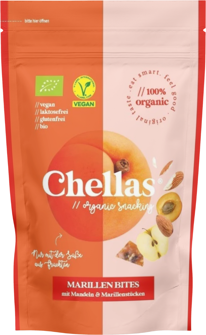 Hedelmäinen, rapea, erehtymätön: Chellasin luomuaprikoosipurtavat yhdistävät kypsän aprikoosin aurinkoisen maun ja hienot mantelit luoden välipalan, joka on täysin lisäaineeton. Makeus tulee yksinomaan luonnosta. Herkullinen resepti ei sisällä keinotekoisia makuaineita, säilöntäaineita tai palmuöljyä. Itävallassa huolellisesti käsin valmistetut ja luonnollisesti luomusertifioidut Chellas Bites ovat enemmän kuin vain välipala käytännöllisessä muodossa. Ne ovat vegaanisia, gluteenittomia ja laktoosittomia, joten ne sopivat täydellisesti arkeen.