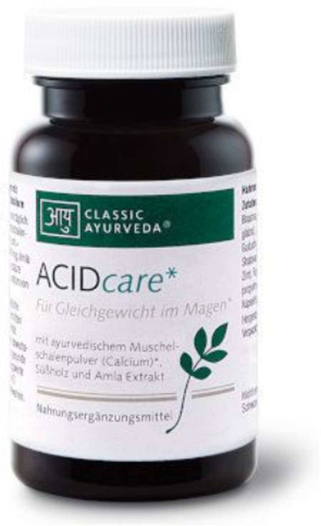 Classic Ayurvedan ACIDcare-kapselit yhdistävät mineraalipitoisen simpukankuorijauheen ja valikoiman perinteisiä kasviainesosia. Koostumukseen sisältyy muun muassa lakritsi, amla, guduchi, shatavari sekä mausteet kuten kaneli, fenkoli ja kardemumma. Sisältävä kalsium edistää ruoansulatusentsyymien normaalia toimintaa. Suositeltu vuorokausiannos sisältää lisäksi 125 mg amla-uutetta, josta 9 mg on gallushappoa.