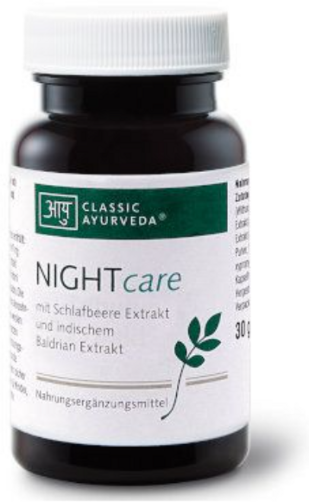 Classic Ayurvedan NIGHTcare-kapselit yhdistävät valikoiman perinteisiä kasviuutteita. Koostumus sisältää ashwagandhaa (unimarja), intialaista valerianjuurta (tagara), brahmia ja mandukaparnia. Tämä tarkkaan suunniteltu yhdistelmä hyödyntää ainoastaan kasvipohjaisia raaka-aineita Intiasta.