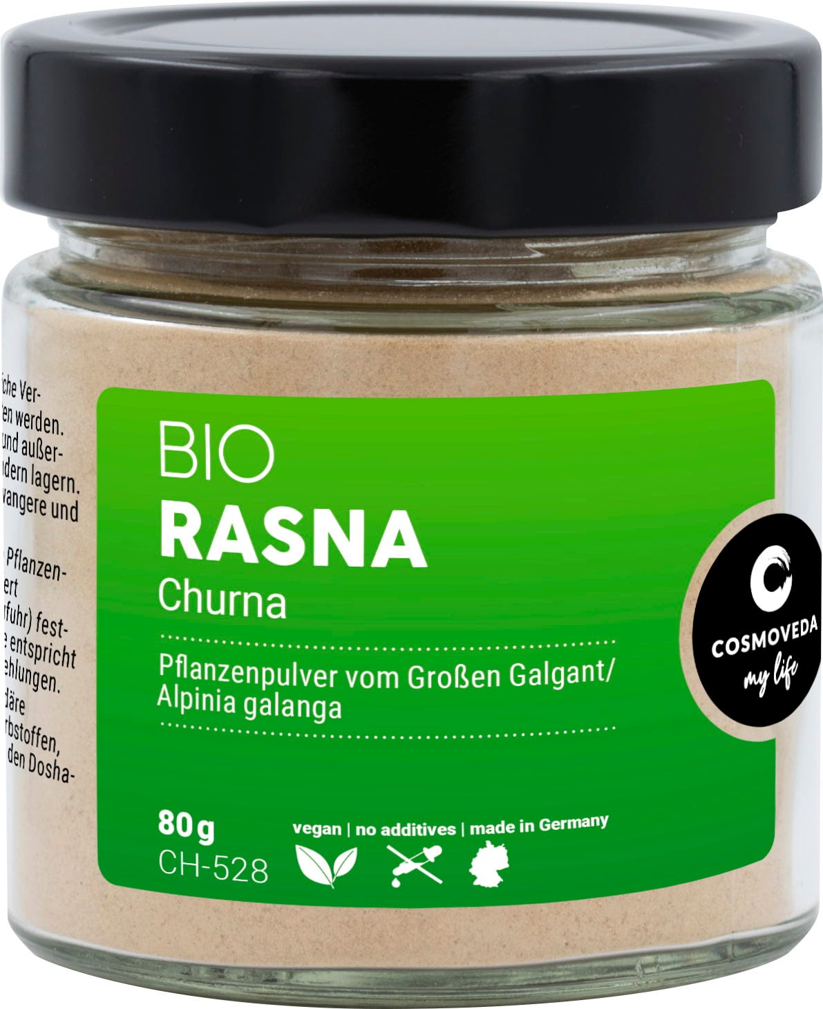 Rasna - Alpinia galanga - on jopa 1,5 m korkea ja iiristä muistuttava kasvi, joka tunnetaan nimellä suurgalanga, jolla on orkideamäisiä valko-punaisia kukkia, jonka juuria käytetään ayurveda-ravitsemuksessa. Tuotannossamme hienoksi ja hellästi jauhetun kuivatun juuren jauhe (alle 40°C) tulee Intian ja Sri Lankan reilun kaupan ja luomuprojekteistamme.