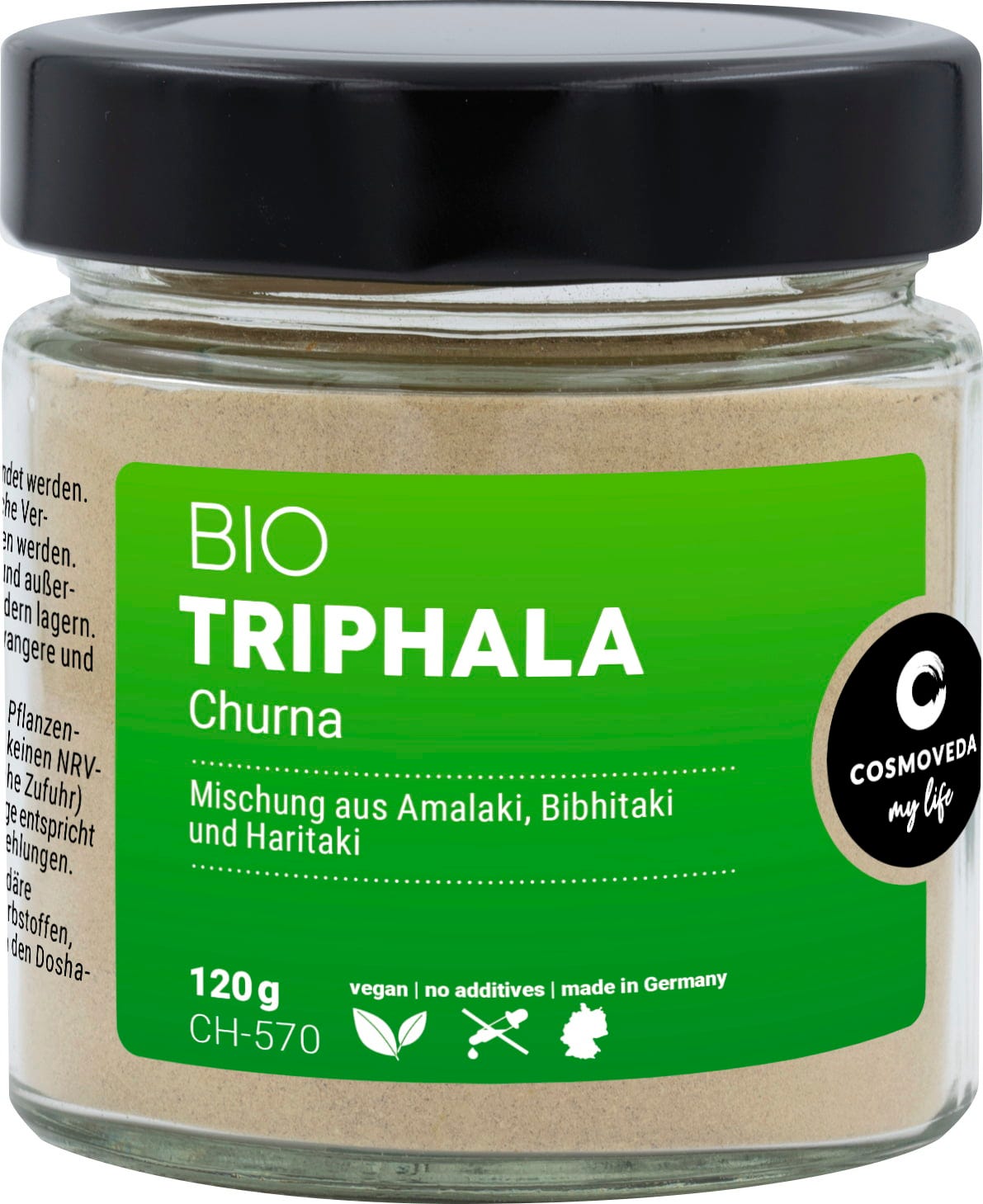Luomu Churna Triphala -sekoitus sisältää jauhetta intialaisen karviaismarjan hedelmistä, Bellerian myrobalan -kasvien hedelmäjauhetta ja suuren myrobalan-kasvin hedelmiä.
