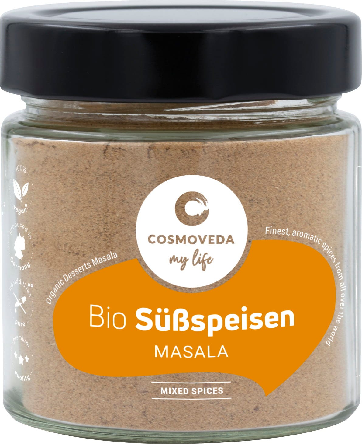 Cosmoveda Masala jälkiruoat rikastuttaa makeita jälkiruokia, kakkuja ja leivonnaisia hieman mausteisella, herkullisella inkiväärin ja kardemumman aromilla.