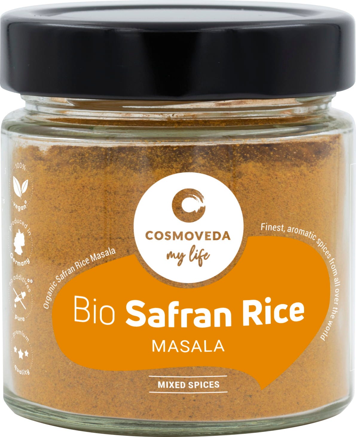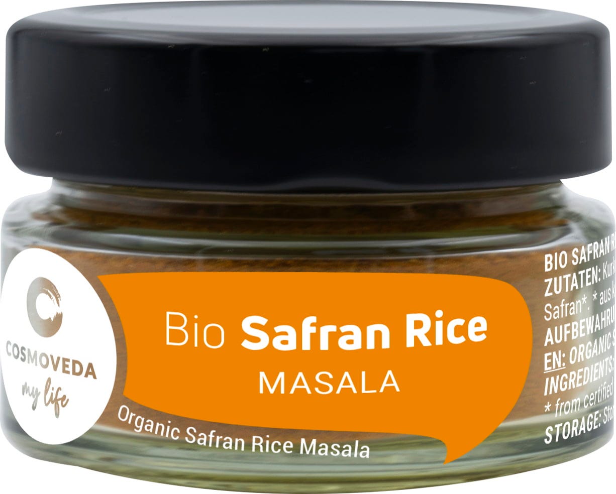 COSMOVEDAn luomu Safran Rice Masala on ayurveda-sekoitus hienoja mausteita, jonka avulla voit valmistat herkullista sahramiriisiä.