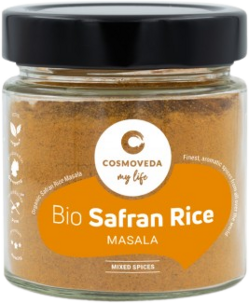 COSMOVEDAn luomu Safran Rice Masala on ayurveda-sekoitus hienoja mausteita, jonka avulla voit valmistat herkullista sahramiriisiä.