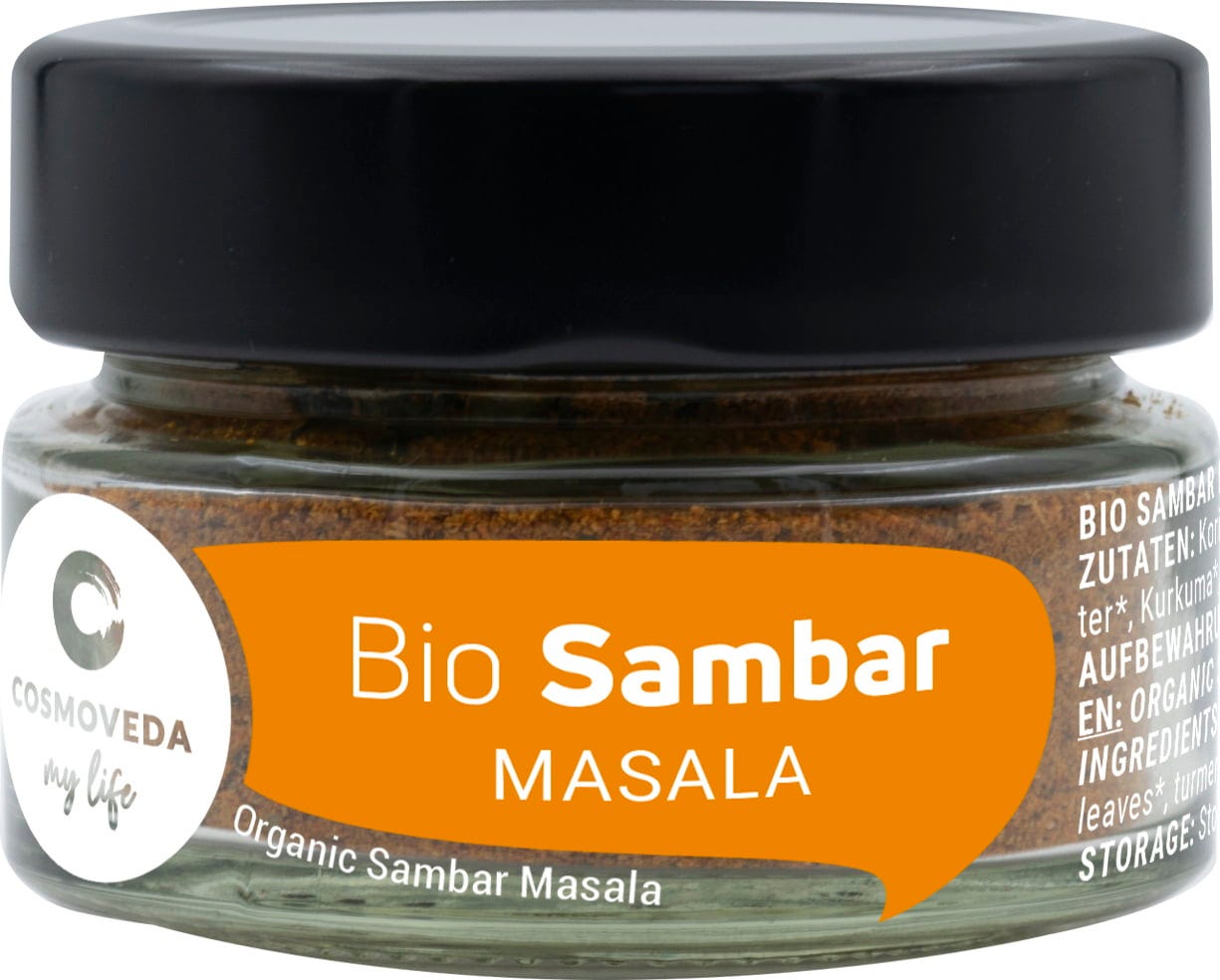 COSMOVEDAn Sambar Masala, on tasapainoinen ayurveda-sekoitus hienoja mausteita, jotka auttavat sinua valmistamaan herkullisen Sambari-kasviskeiton.