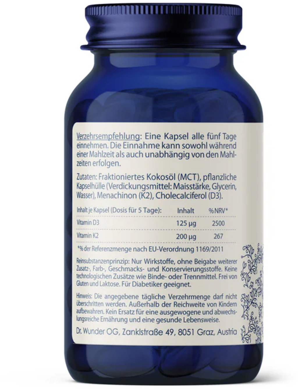 Fraktioniertes Kokosöl, pflanzliche Kapselhülle (Carrageen, Glycerin, Wasser), Menachinon (Vitamin K2), Cholecalciferol (Vitamin D3)
