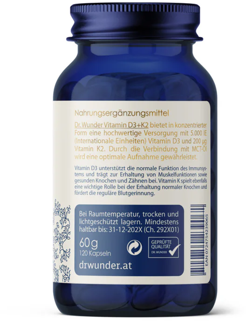 Dr. Wunder D3+K2-vitamiinit 5000 IU, 120 kapselia