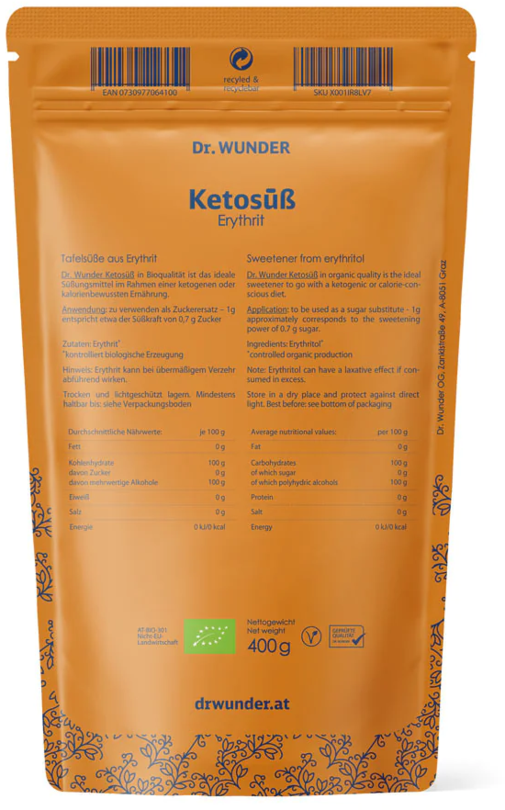 Tämä pöytäsokeri erytritolista on täydellinen makeutusaine ketogeeniseen ja kaloritietoiseen ruokavalioon. Luonnollisesti luomu-laatua ja pakattu uudelleen suljettavaan kierrätettävään muovipussiin.