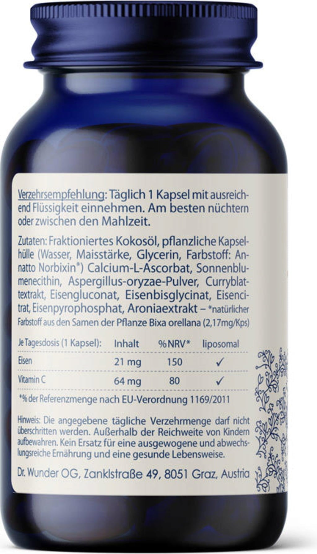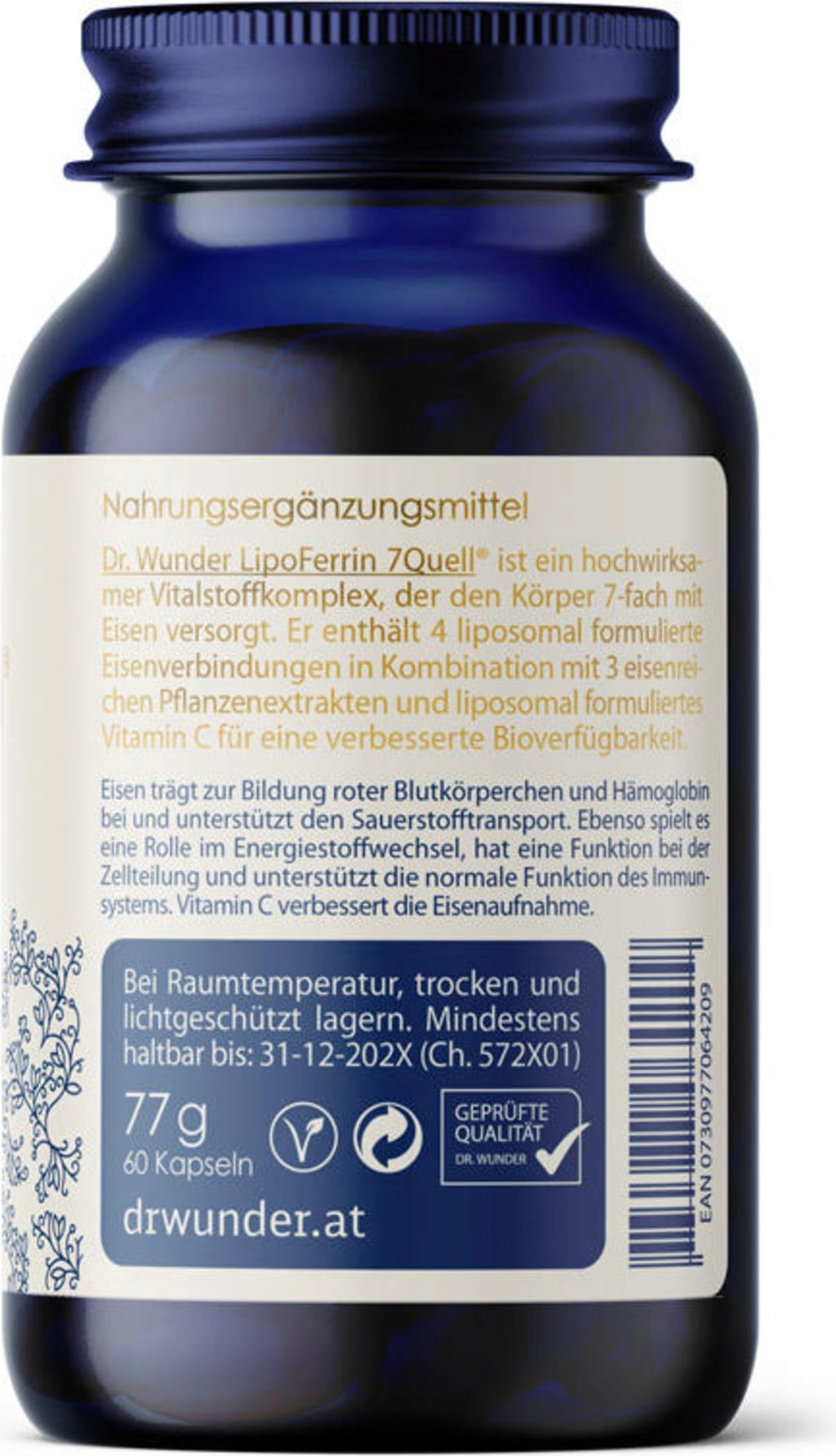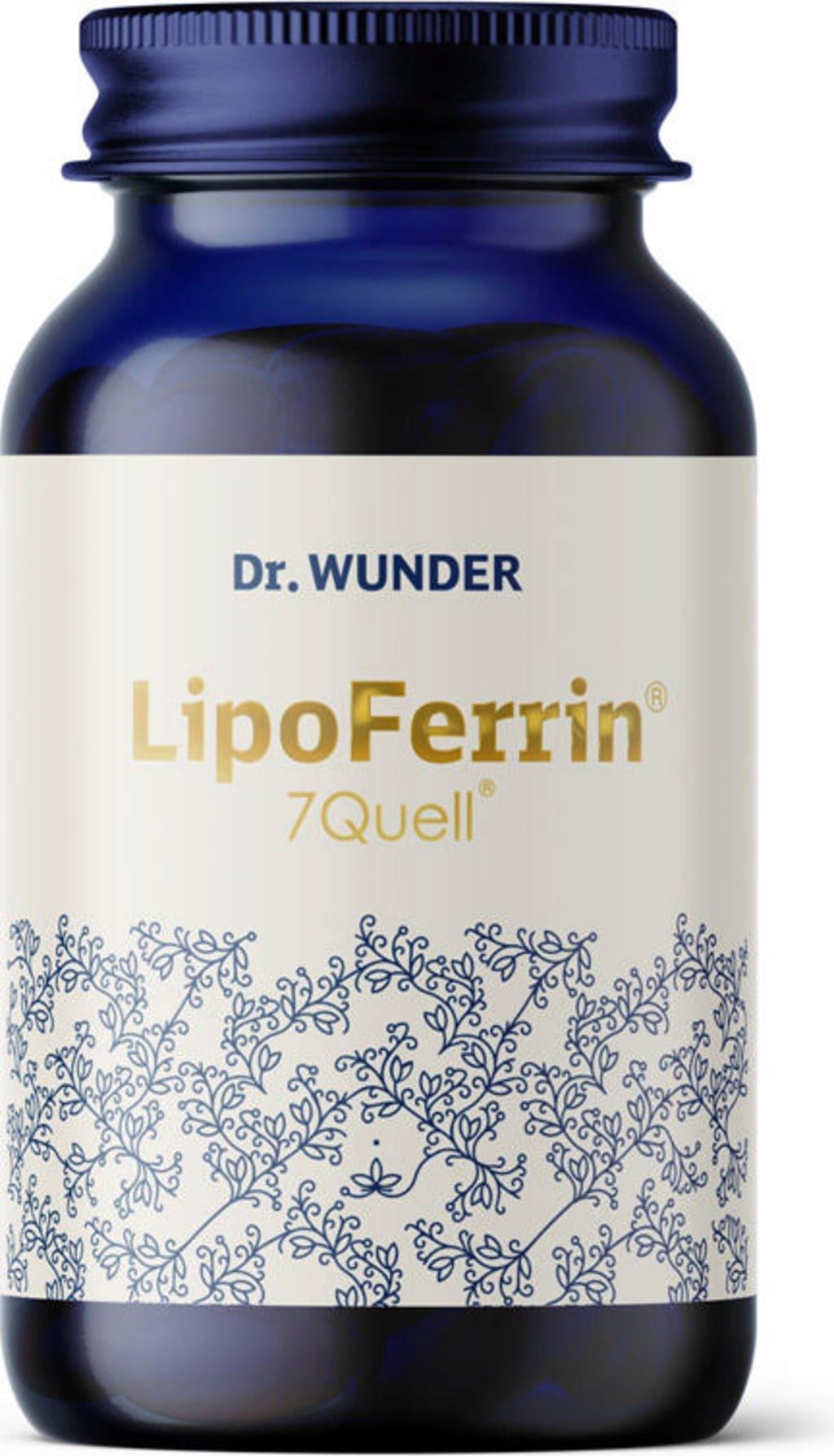 LipoFerrin 7Quell® (Rauta) -pehmekapselit Dr. Wunderilta antavat kehollesi seitsenkertaisen määrä raudasta – kapselit sisältävät 4 liposomaalisesti formuloitua rautayhdistettä ja 3 rautapitoista kasviuutetta. Lisäksi kapselit sisältävät liposomaalista C-vitamiinia.
