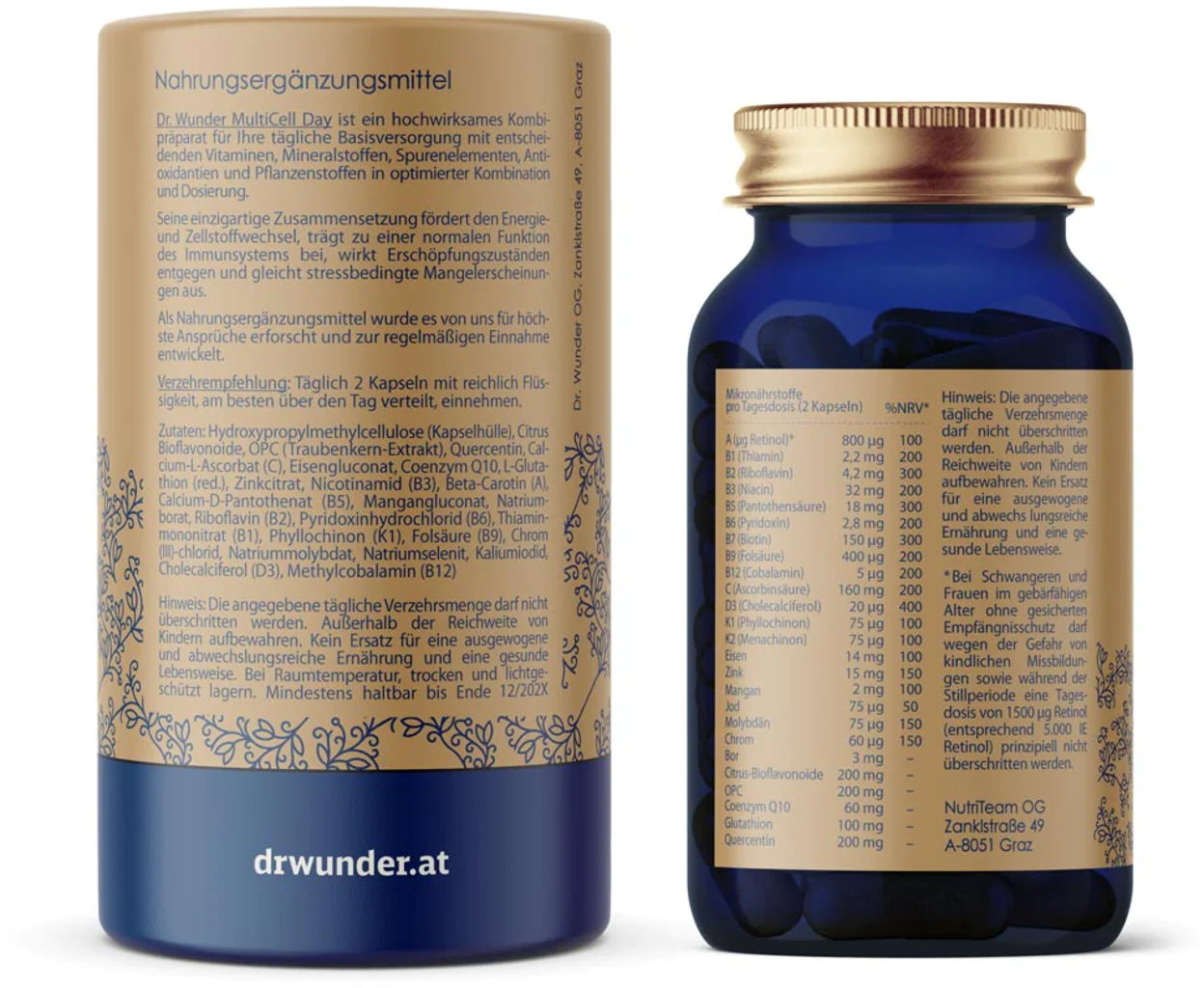 Dr. Wunder MultiCell® Day on täydellinen valmiste, joka sisältää 25 valikoitua mikroravintoainetta. Se tarjoaa vitamiineja, kivennäisaineita, hivenaineita, antioksidantteja ja kasviperäisiä aineosia optimaalisessa yhdistelmässä ja annostelussa päiväsaikaiseen käyttöön. Kehitetty korkeimpien laatuvaatimusten mukaisesti ja säännölliseen käyttöön.