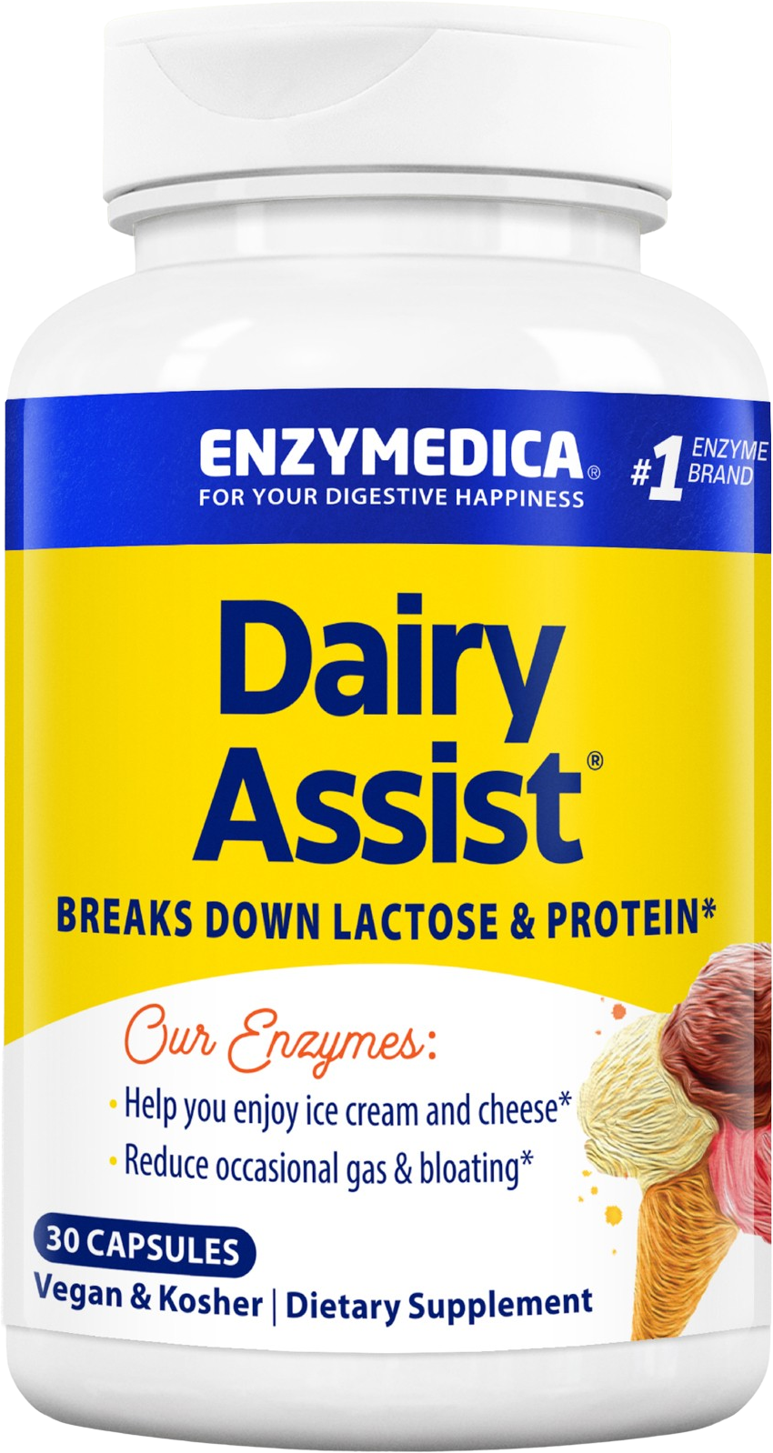 Enzymedican Dairy Assist on entsyymisekoitus ruoan sisältämän laktoosin ja kaseiinin pilkkomiseen.