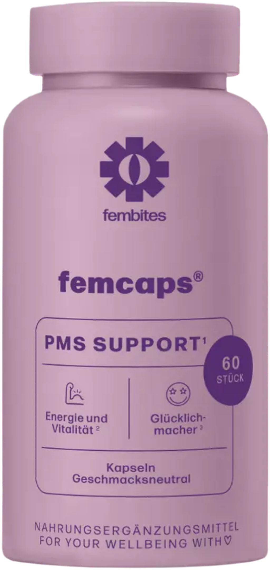 fembites-femcaps® PMS TUKI-kapselit tarjoavat optimaalista tukea kierron toisella puoliskolla. Niiden vegaaninen koostumus ei sisällä keinotekoisia lisäaineita tai hormoneja. Sen sijaan kapselit sisältävät macajauhetta ja ruusunmarjajauhetta. Koostumusta on täydennetty muun muassa B12-vitamiinilla, sinkillä ja L-tryptofaanilla.