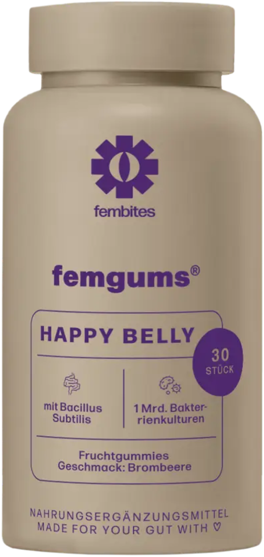 Femgums® HAPPY BELLY -hedelmäkarkit sisältävät miljardi elävää bakteerikantaa kutakin hedelmäkarkkia kohden. Näiden koostumus on vegaaninen ja ilman lisättyä sokeria. Erilaisista marjoista valmistettu hedelmäsosemix varmistaa erityisen hedelmäisen ja makean maun.