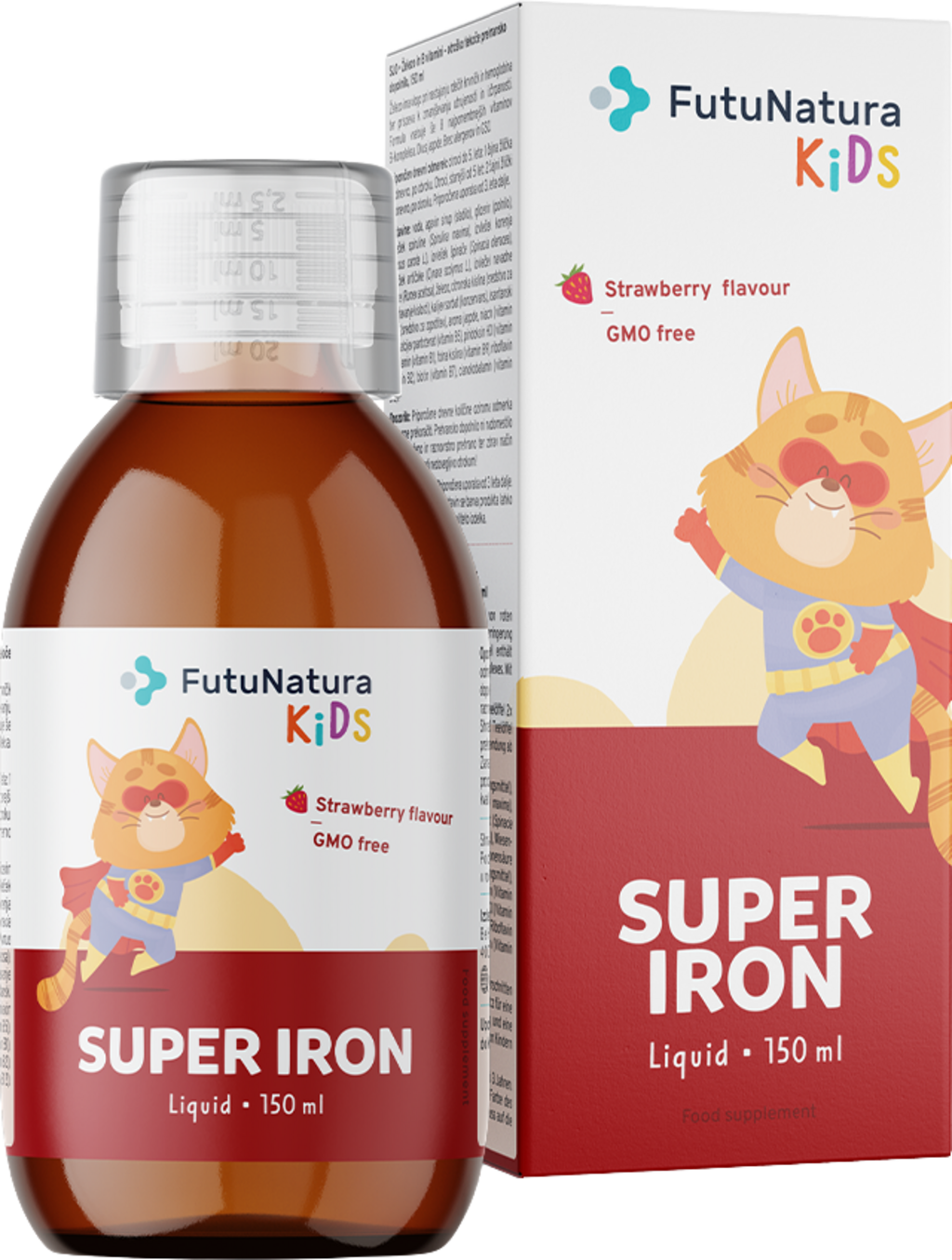 Super Iron FutuNatura Kids -tuotesarjalta tarjoaa rautaa. Lisäksi neste sisältää kaikki B-vitamiinit: B1, B6 ja B12. Lisäksi Super Iron on rikastettu kasviuutteilla. Se on GMO-vapaa ja helppo annostella.