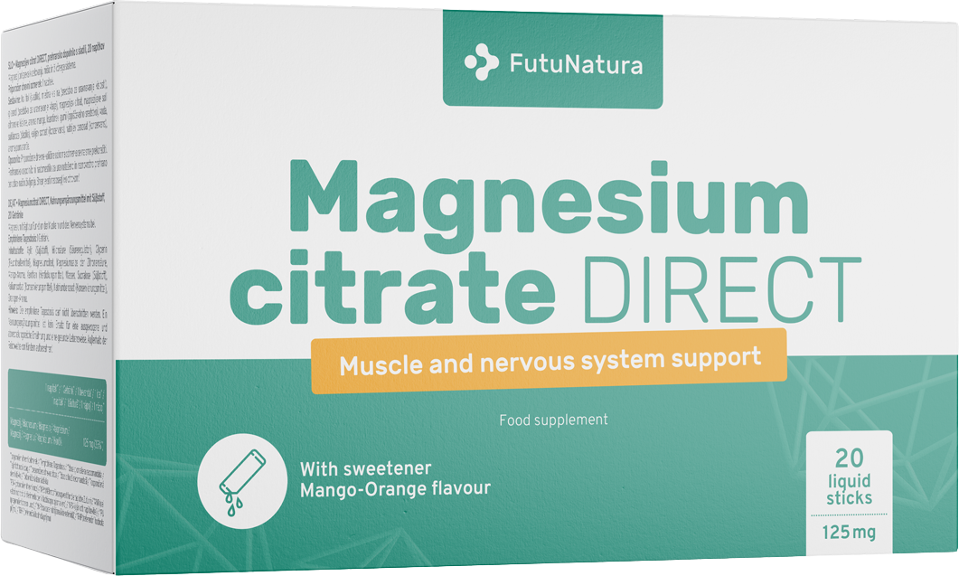 Magnesiumsitraatti DIRECT sisältää magnesiumsitraattia, joka on magnesiumin orgaaninen muoto. Tuote tarjoaa miellyttävän yhdistelmän mango- ja appelsiinimakua. Se on käytännöllisesti pakattu, mikä mahdollistaa helpon nauttimisen missä ja milloin tahansa.