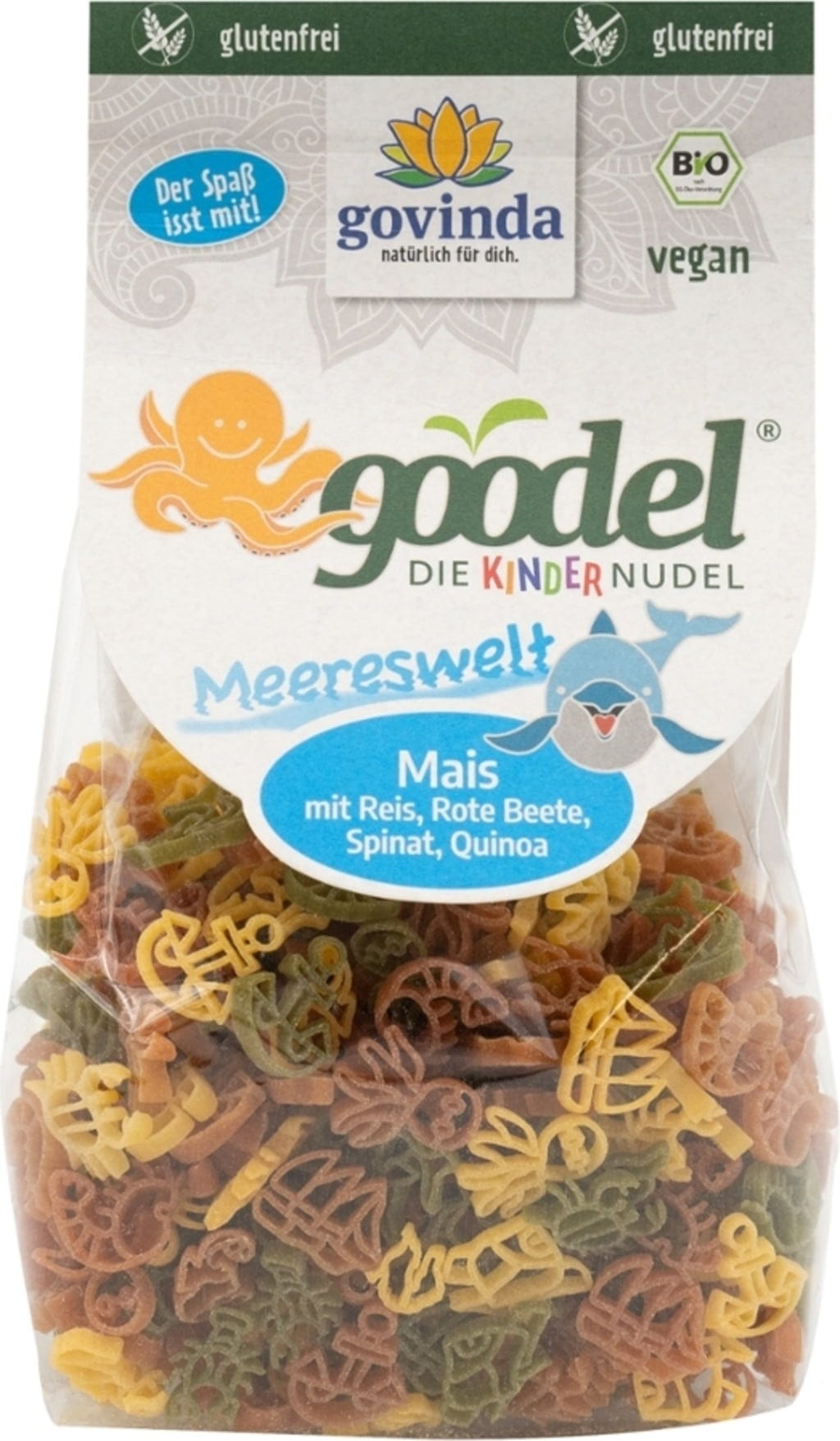 Kinder-Goodel "Merimaailma" Govindalta tuo värikkään pastan ilon merenelävien muodossa pöytään. Italialaisella käsityölaatua valmistettuna, maissin ja riisin mieto perusta on luonnollisesti viimeistelty punajuurella, pinaatilla ja kvinoalla. Hellävaraisesti kuivattu pasta on gluteeniton ja tarjoaa klassisen al-dente purutuntuman. Tietoinen valinta monipuoliseen ruokavalioon perhekeittiössä.