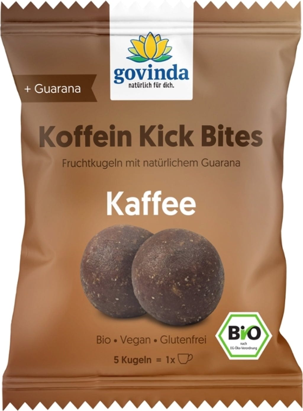 Govindan Kofeiini Kick Bites yhdistää taatelien ja maakastanjoiden luonnollisen makeuden aromikkaaseen kahviuutteeseen. Hakattujen hasselpähkinöiden ja aidon guaranan maustama makeinen tarjoaa intensiivisen maun luomulaatuisena. Gluteeniton ja vegaaninen makeinen on täydellinen valinta tietoiselle välipalalle kätevässä muodossa, ilman keinotekoisia lisäaineita.