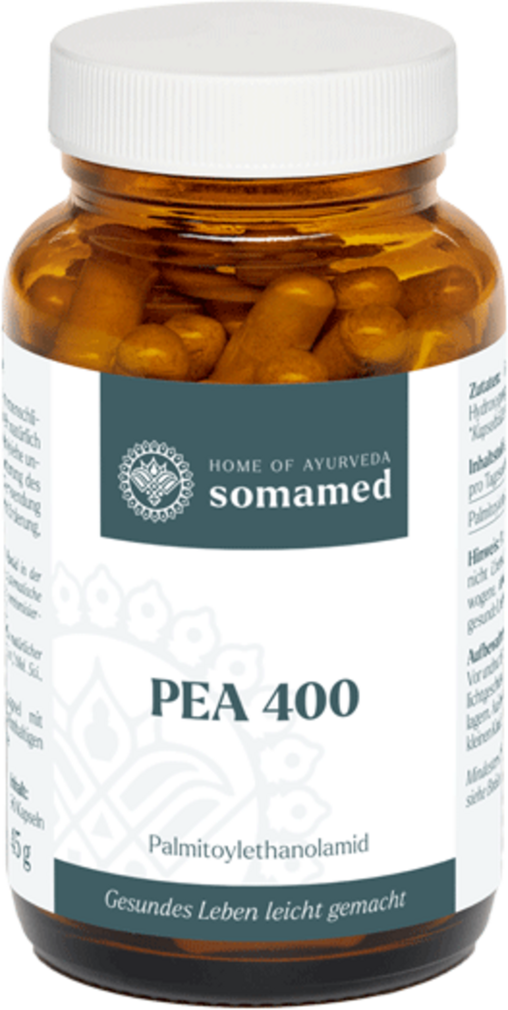 PEA 400 Home of Ayurveda somamed sisältää palmitoiletanoliamidia (PEA) uudessa, mikronisoidussa koostumuksessa. Erityisen hienon partikkelikoon (95 % < 10 µm) ansiosta saavutetaan parannettu liukeneminen ruoansulatuskanavassa. Mikronisoitujen PEA:n muotojen katsotaan olevan teknologisesti optimoitu vaihtoehto asiantuntijakirjallisuudessa.