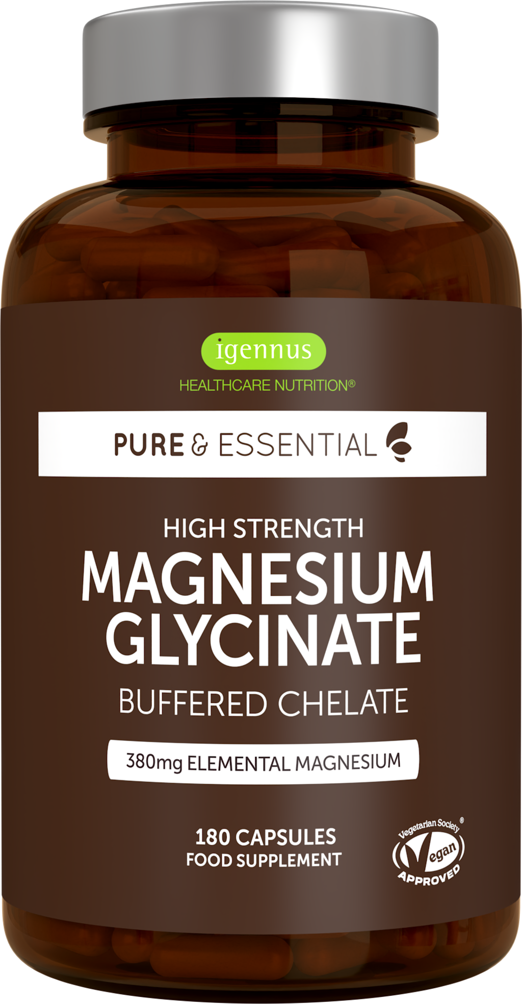 Igennuksen High Strength Magnesium Glycinate Buffered Chelate varmistaa sinulle laadukkaan magnesiumin saannin tehokkaassa muodossa. Jokainen päivän annos tarjoaa sinulle 380 mg elementaarista magnesiumia 1300 mg:sta puskuroitua magnesiumglysinatiinia – vakaa yhdiste magnesiumia ja aminohappo glysiiniä.