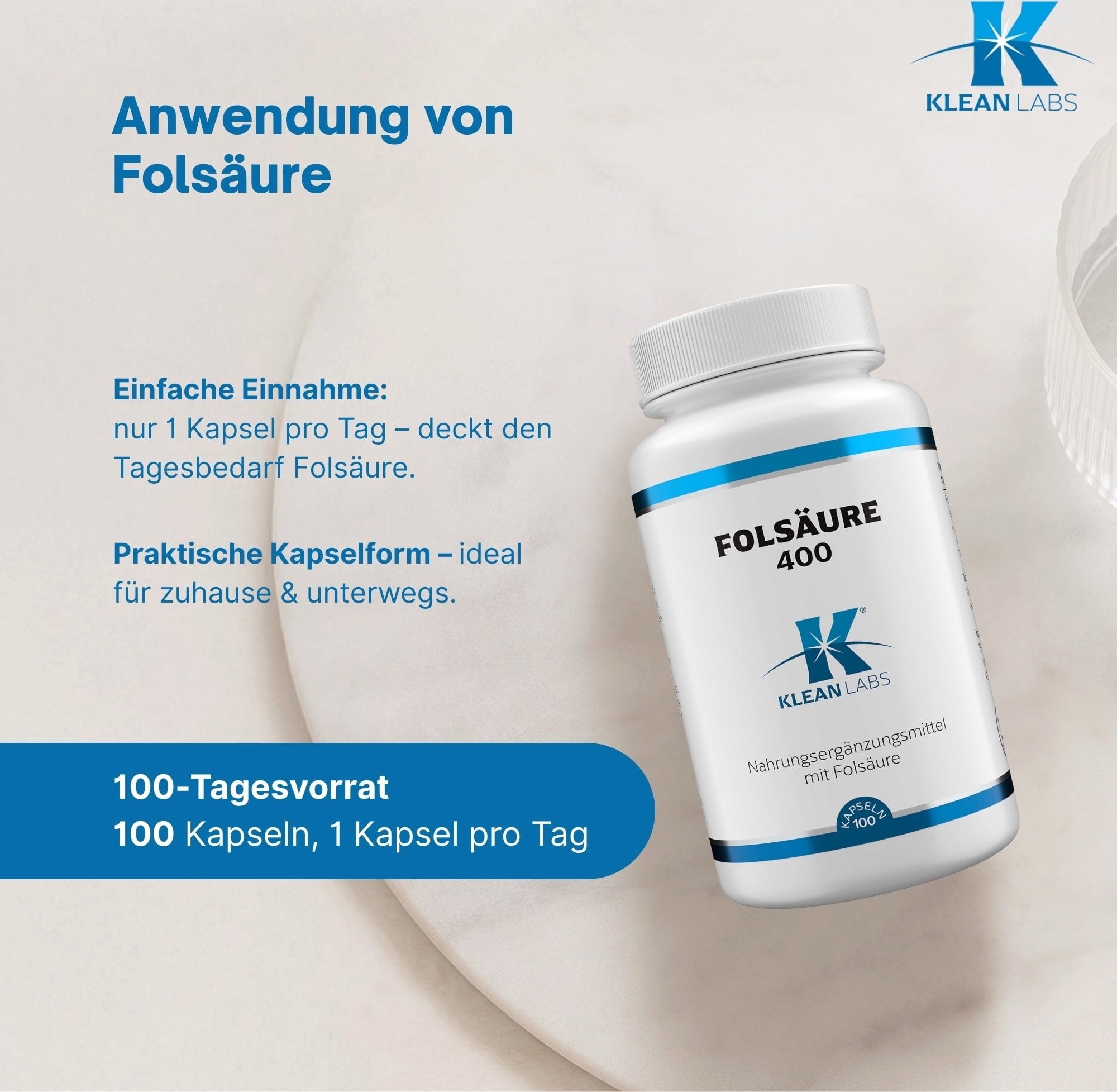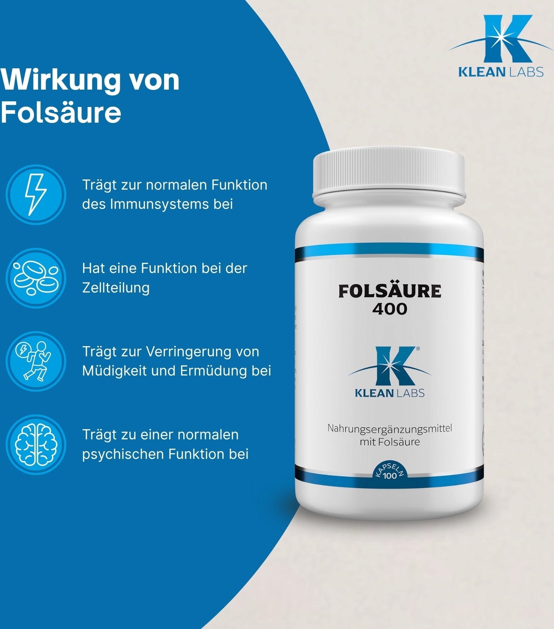 KLEAN LABS Foolihappo 400, 100 kapselia