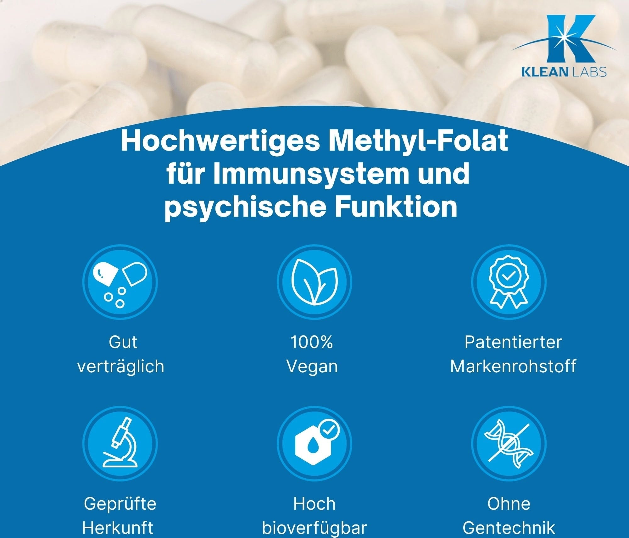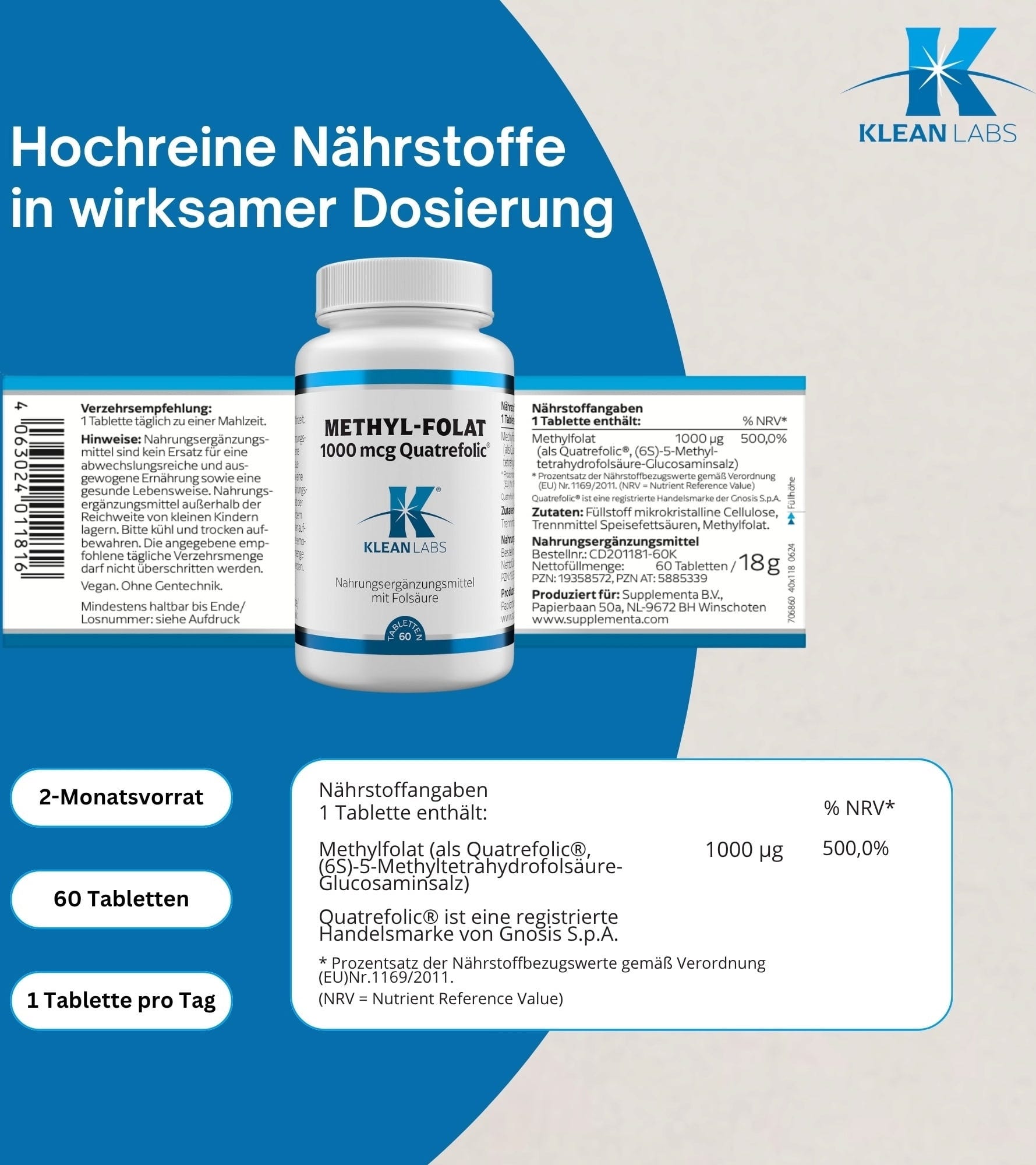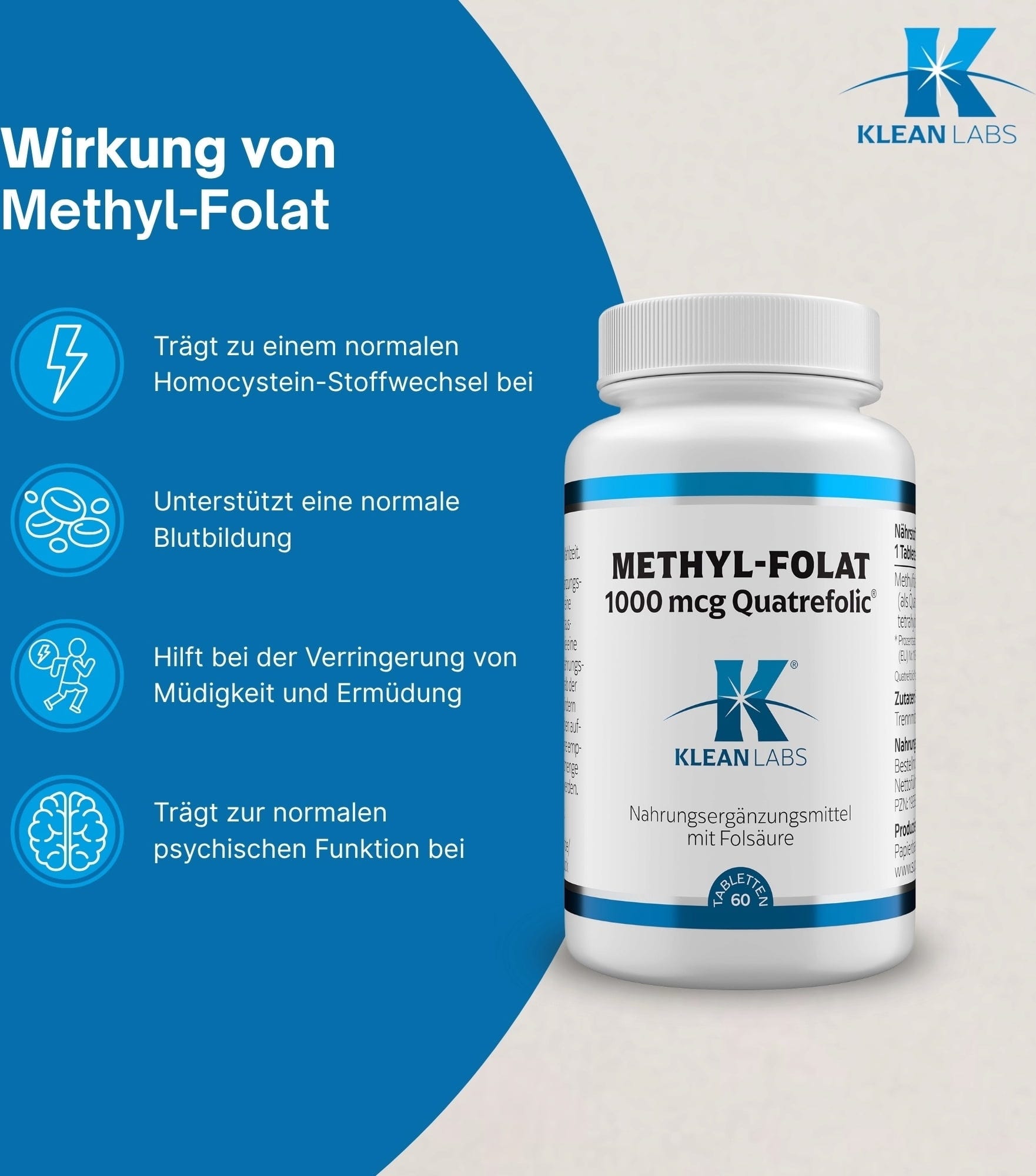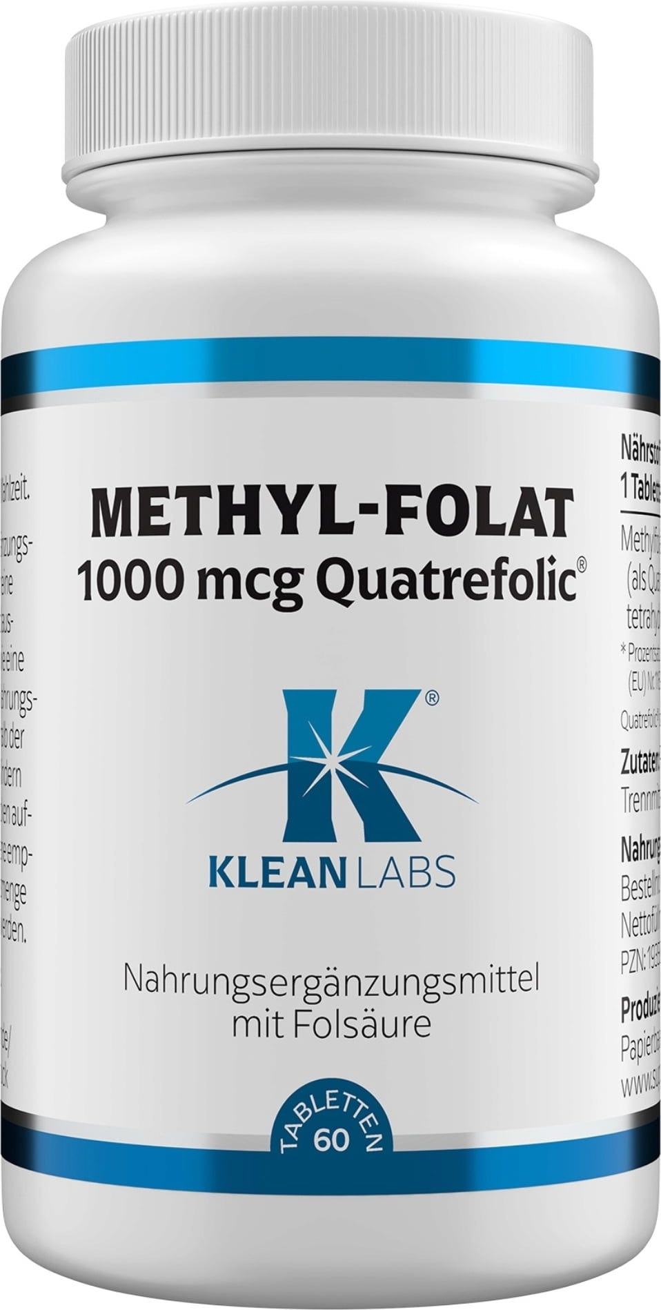 Metyyli-folaatti on vallitseva folaatin muoto, jota esiintyy kehon soluissa. KLEAN LABSin metyyli-folaatti-tabletit sisältävät Quatrefolic®*-merkinnällistä metyyli-folaattia. Tablettien koostumus on vegaaninen ja geenimanipuloimaton.