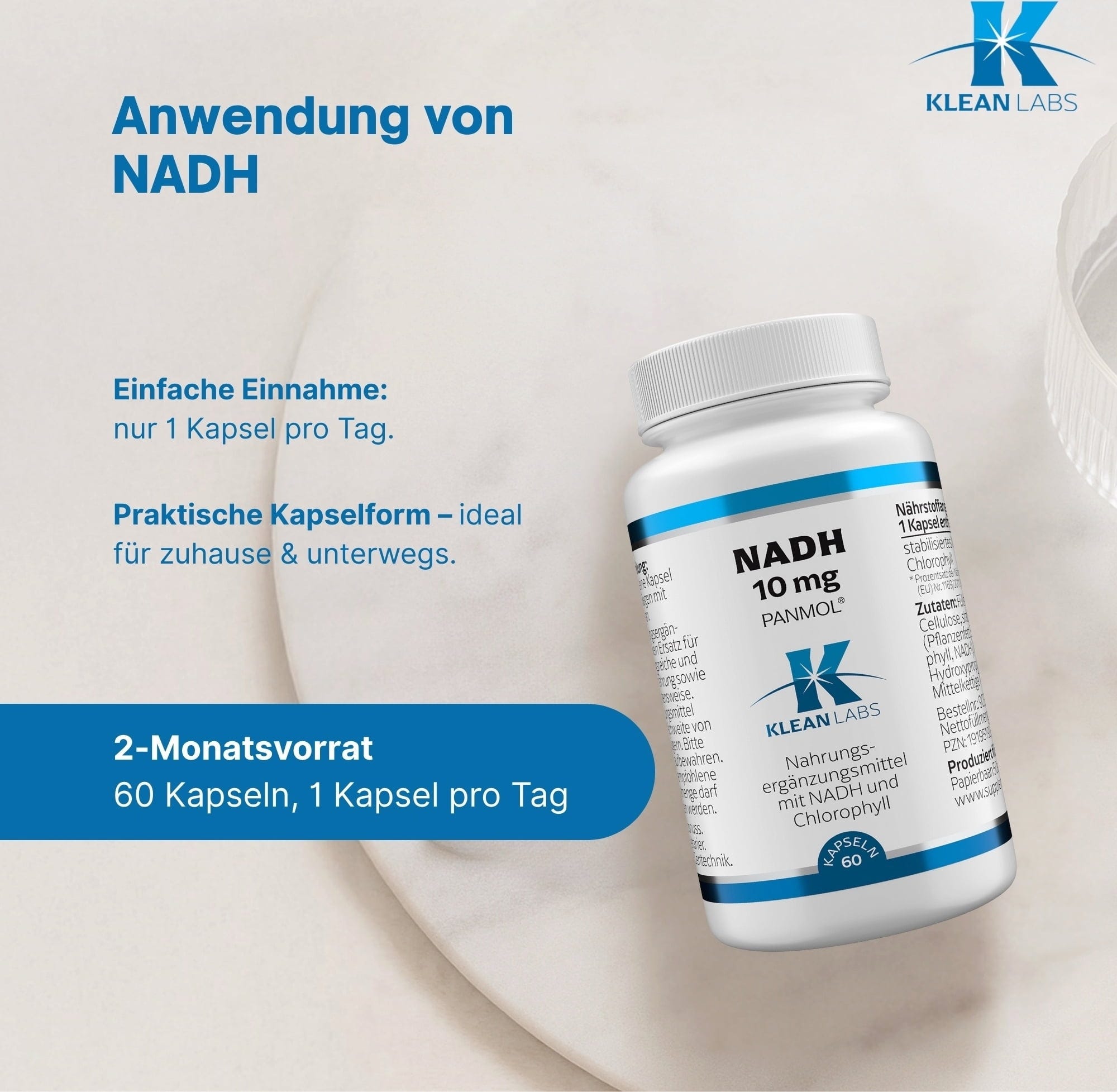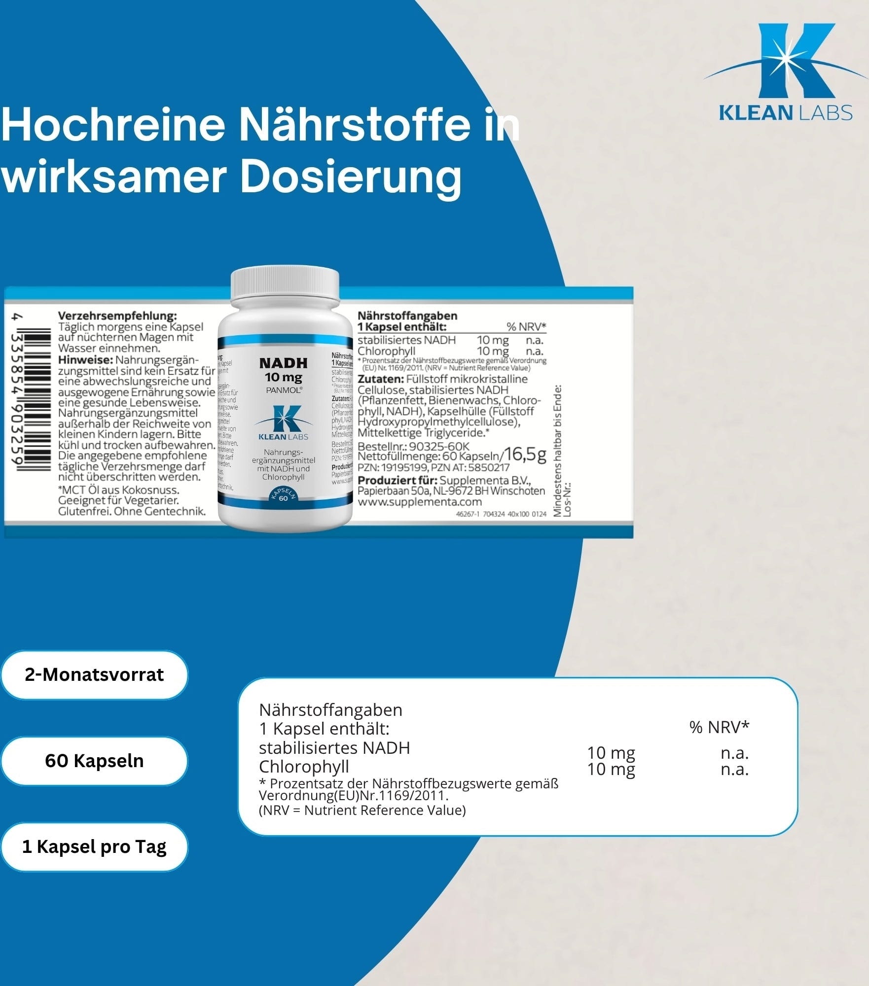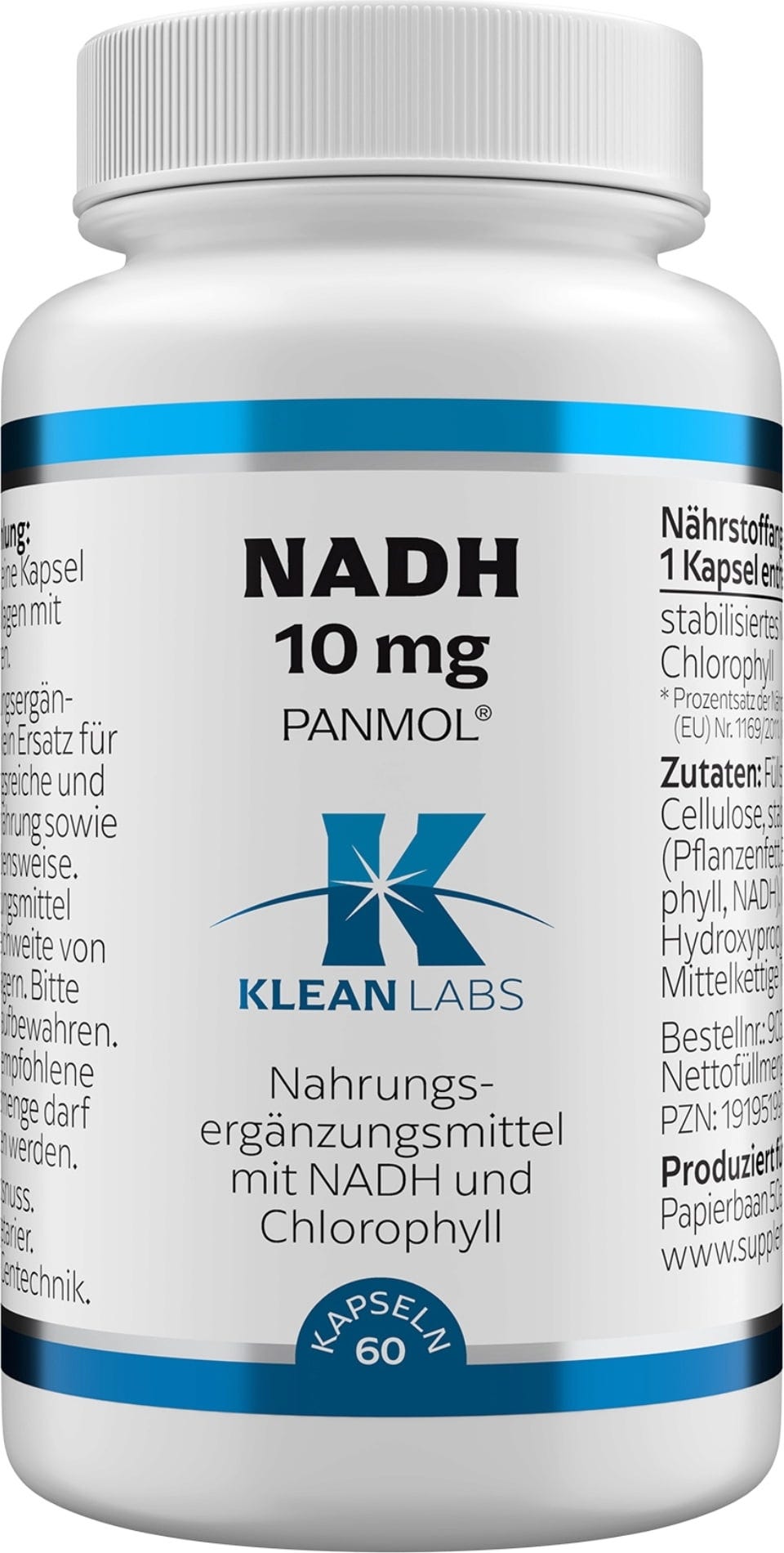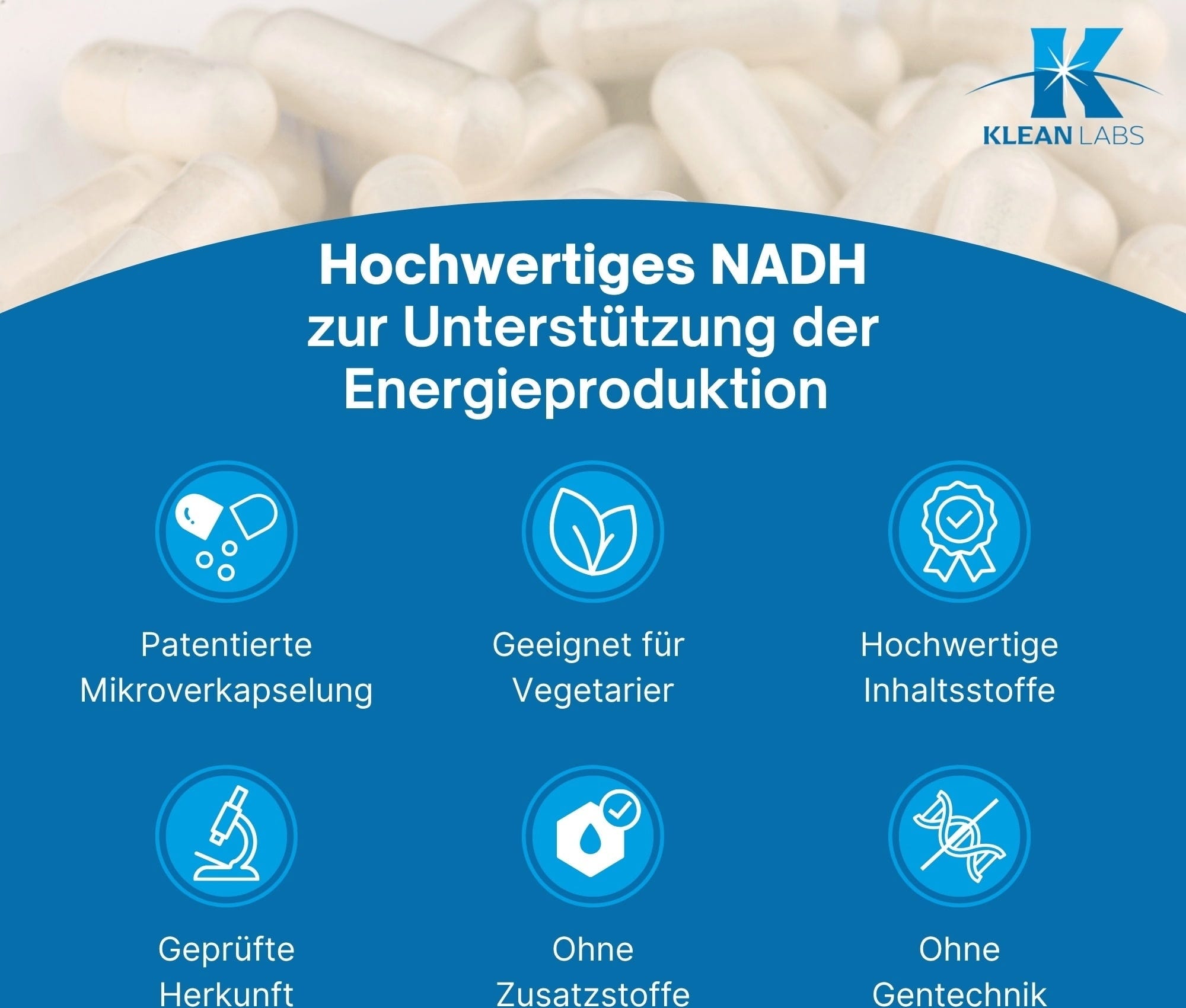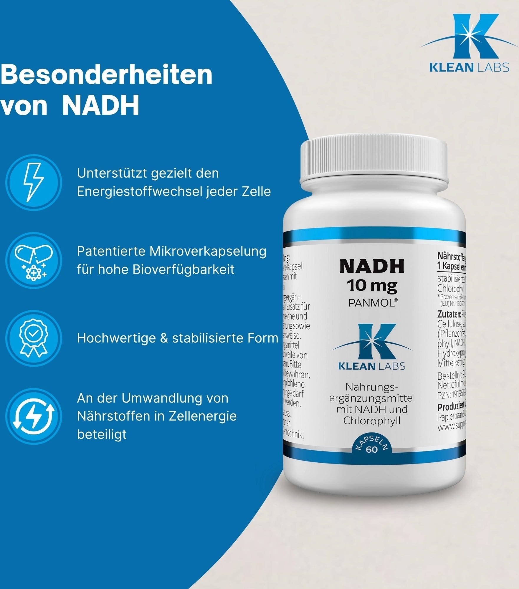 NADH tunnetaan myös koentsyymi 1:nä ja se on valon-, ilman-, lämpötilan- ja kosteudenherkkä. KLEAN LABS käyttää patentoitua menetelmää, jossa käytetään luonnollista klorofylliä NADH:n stabiloimiseksi kapseleissa. Kapseleilla on mikrokuorinta. Lisäksi kapselit ovat kasviperäisiä eivätkä sisällä geenimuunneltuja ainesosia.