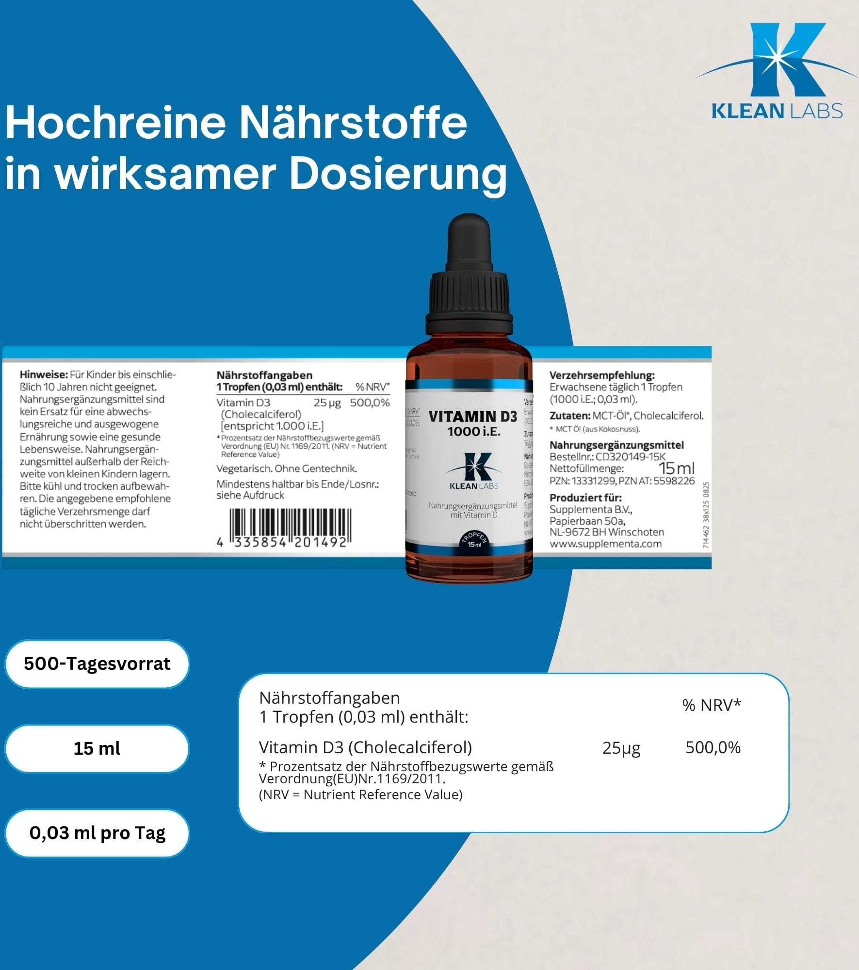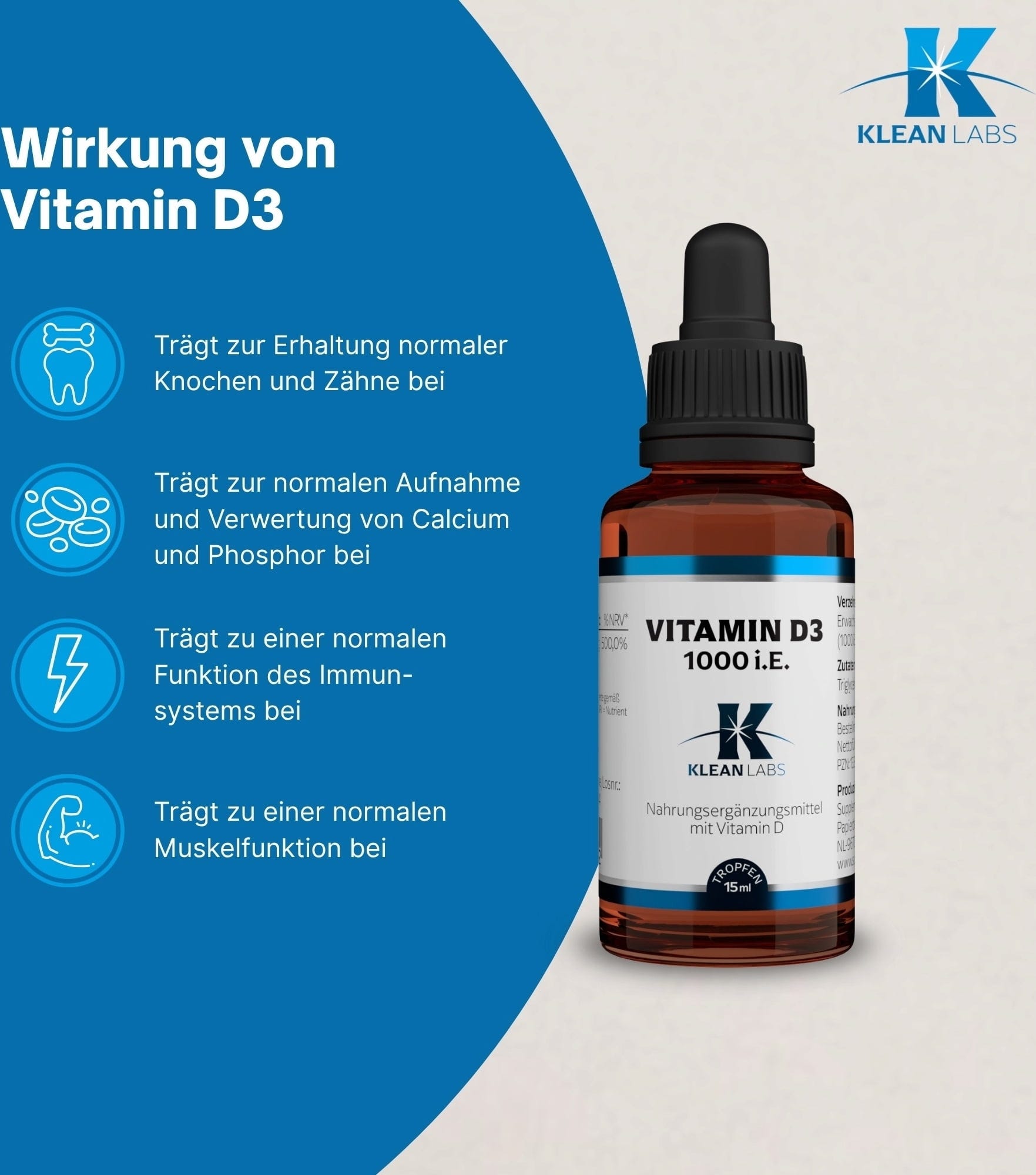 KLEAN LABS Nestemäinen D-vitamiini D3 1000 i.E., 15 ml
