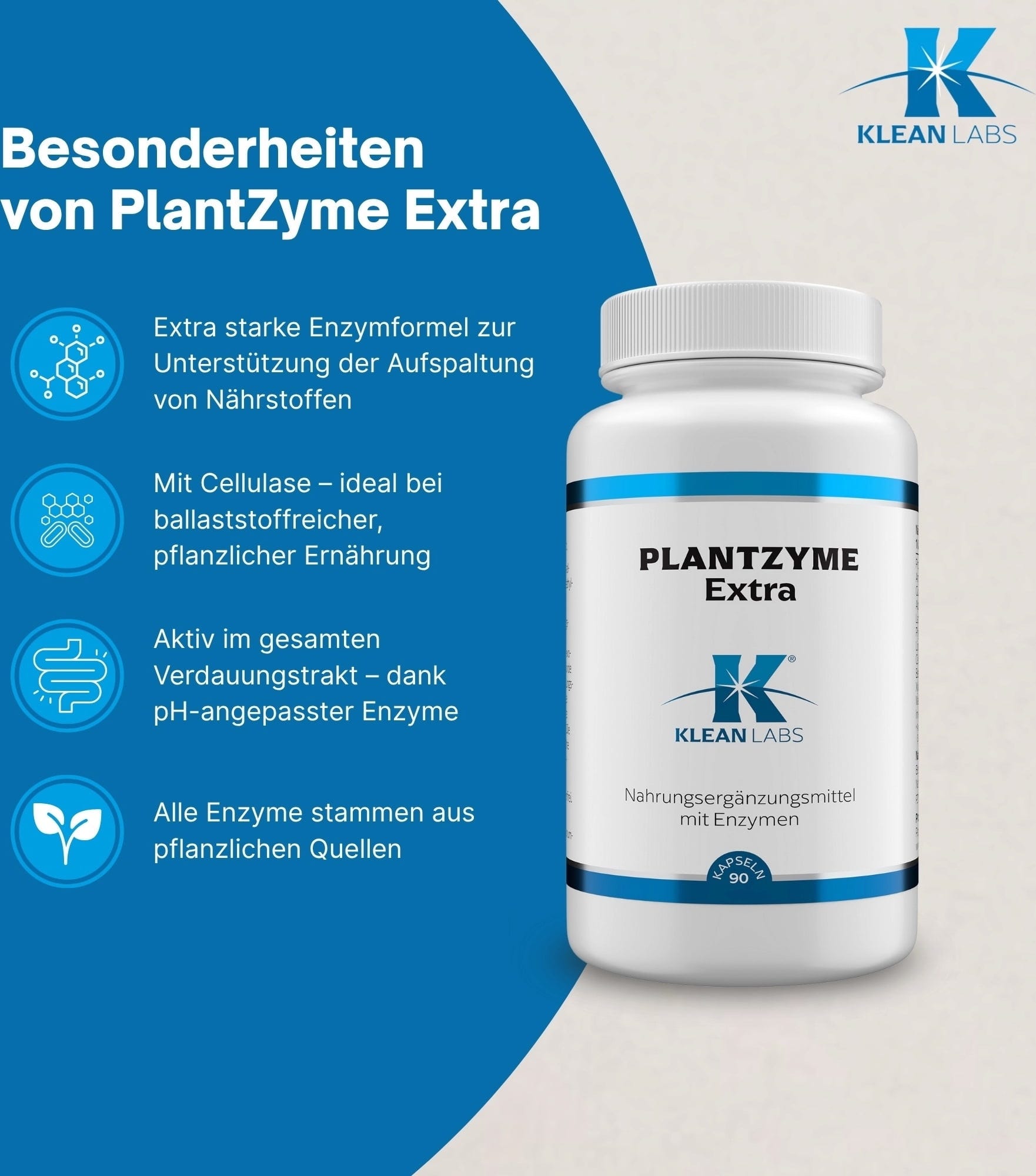 PlantZyme Extra KLEAN LABS sisältää erityisen korkean annoksen kasvi-entsyymejä ja lisäksi sellulaasia. Tämä erityinen koostumus kattaa laajan ravintoainekirjon ja on pH-stabiili. Valmiste sopii myös kuitupitoiseen, kasvipainotteiseen ruokavalioon.