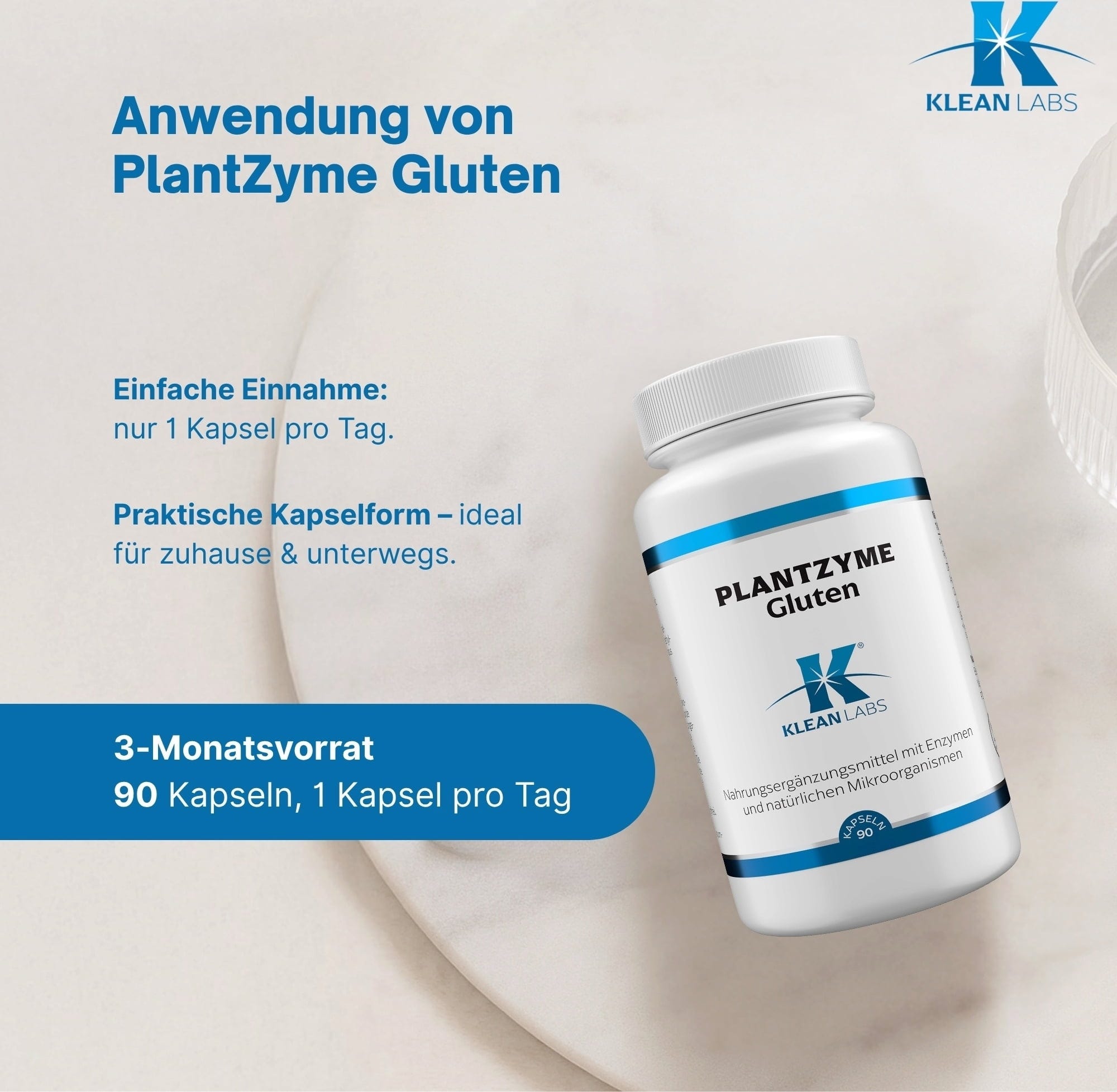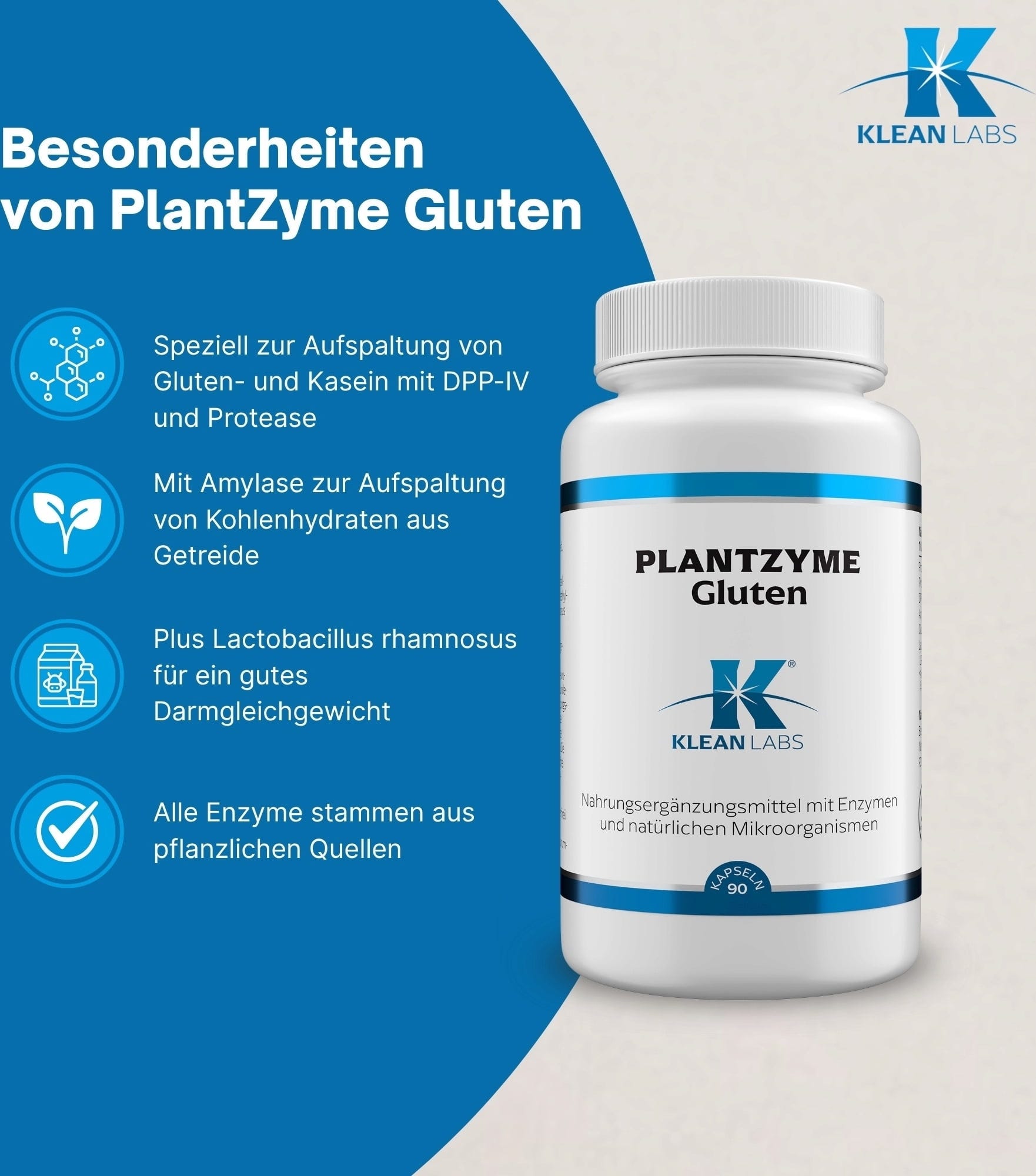PlantZyme Gluten sisältää yhdistelmän proteaasia ja DPP-IV-entsyymiä, joka pilkkoo erityisesti gluteenia ja kaseiinia. Amylaasi täydentää koostumusta tukemalla viljojen tärkkelyksen hajottamista. Tuote on täysin vegaaninen, gluteeniton, geenimuuntelematon ja ilman keinotekoisia lisäaineita.