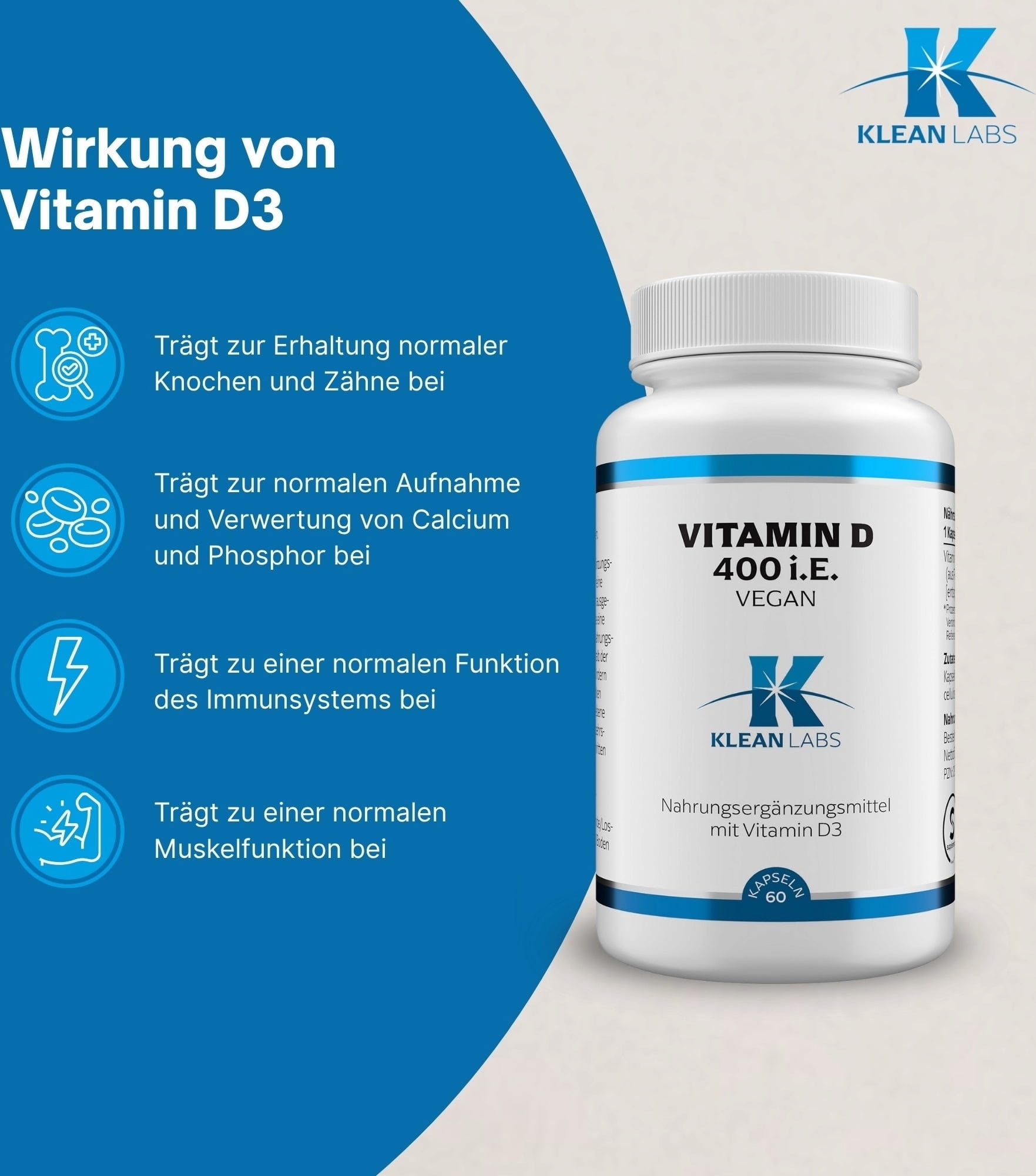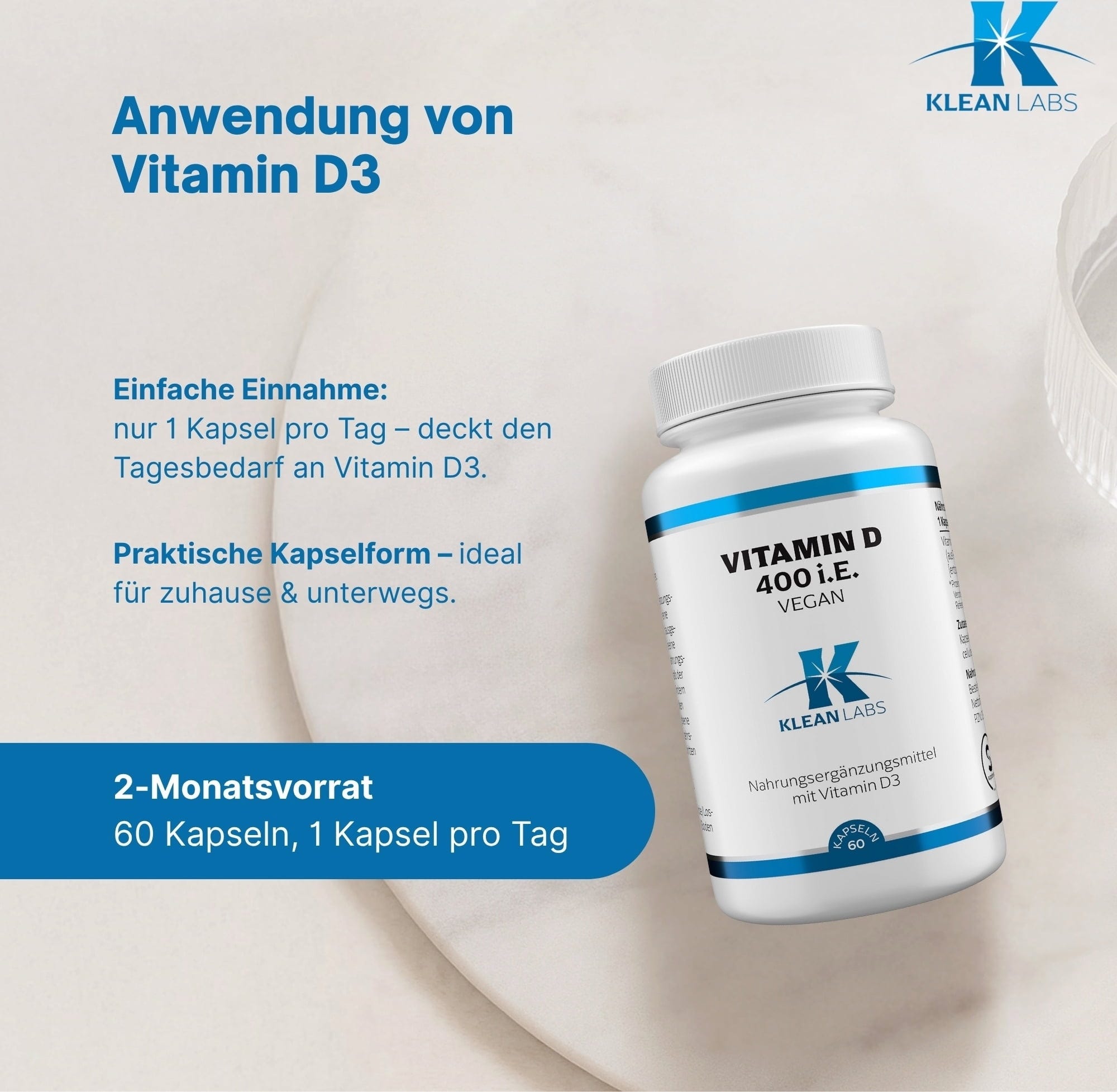 Füllstoff (Mikrokristalline Cellulose), Kapselhülle (Füllstoff (Hydroxypropylmethylcellulose)), Vitamin D3[1]
