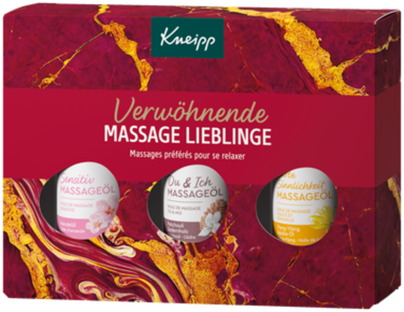 Tämä Kneipp-lahjasetti sisältää kolme hierontaöljyä kätevässä koossa erityisiin rentoutushetkiin. Arvokkaat öljyt levittyvät helposti, imeytyvät miellyttävästi ja tekevät ihosta pehmeän ja sileän. Jokainen tuoksu kehittyy hieronnan aikana vapautuvan lämmön myötä ja tekee jokaisesta hieronnasta ihanan hetken. Ihana lahja toiselle tai pieni hemmottelu itsellesi.