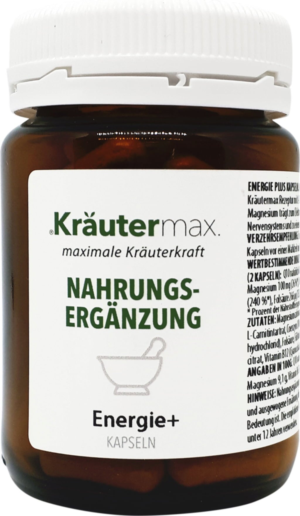 Kräutermaxin Energie + -kapselit sisältävät L-karnitiiniä, tauriinia, magnesiumia ja vitamiineja, kuten B12-vitamiinia.