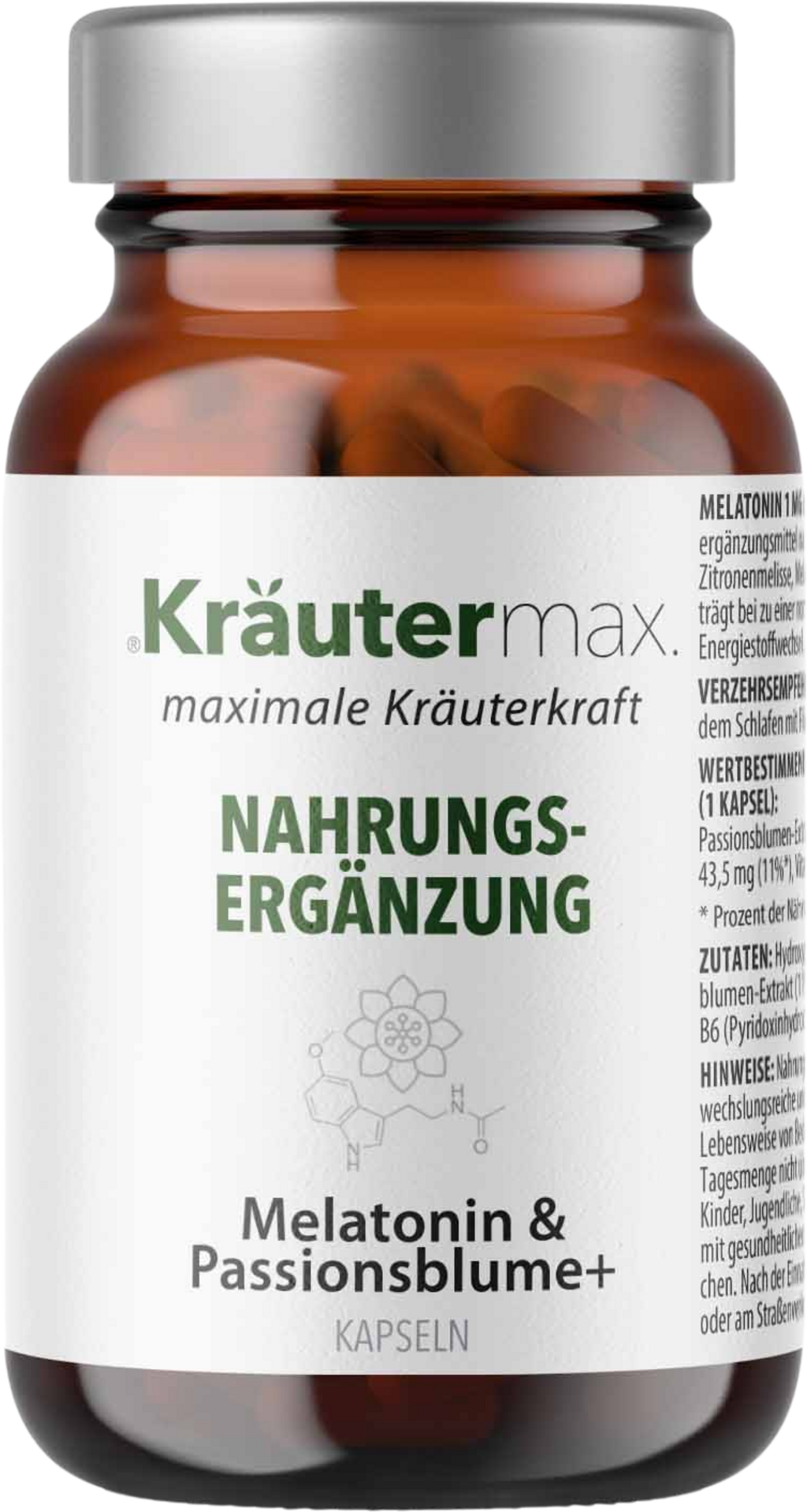 Tutustu vegaaniseen Kräutermax-koostumukseen, joka sisältää valikoituja kasviuutteita ja mikroravintoaineita: Melatoniinikapselit, joissa on kärsimyskukkauutetta, yhdistävät laadukkaita aineosia kuten melatoniinia (1 mg), kärsimyskukkaa, sitruunamelissaa, magnesiumia ja B6-vitamiinia – täydellisesti sovitettu päivittäiseen ravintolisärutiiniisi.