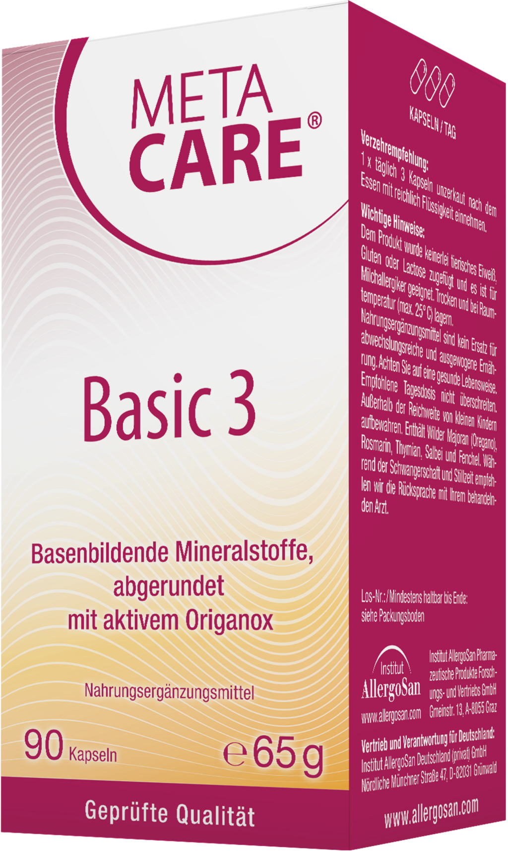 META-CARE® Basic 3 -tuote tarjoaa mineraalikolmikon kaliumin, kalsiumin ja magnesiumin kapselimuodossa. Lisäksi kapselit on rikastettu arvokkailla kasviperäisillä ainesosilla: oreganolla, rosmariinilla, timjamilla, salvialla ja fenkolilla. Kapselit ovat täysin vegaanisia ja geenimuunteluvapaita.