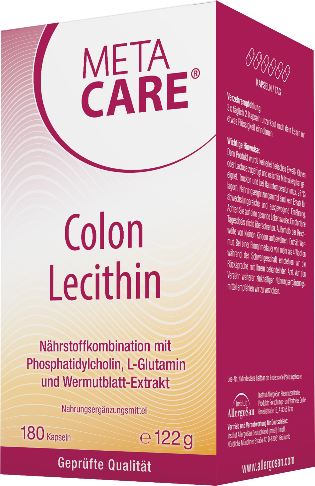 META-CARE® Colon-Lecithin tarjoaa sinulle laadukasta fosfatidyylikoliinia (lesitiiniä) kapselimuodossa. Lisäksi koostumusta on täydennetty B6- ja B12-vitamiinilla, sinkillä, L-glutamiinilla ja koiruohonlehtiuutteella.