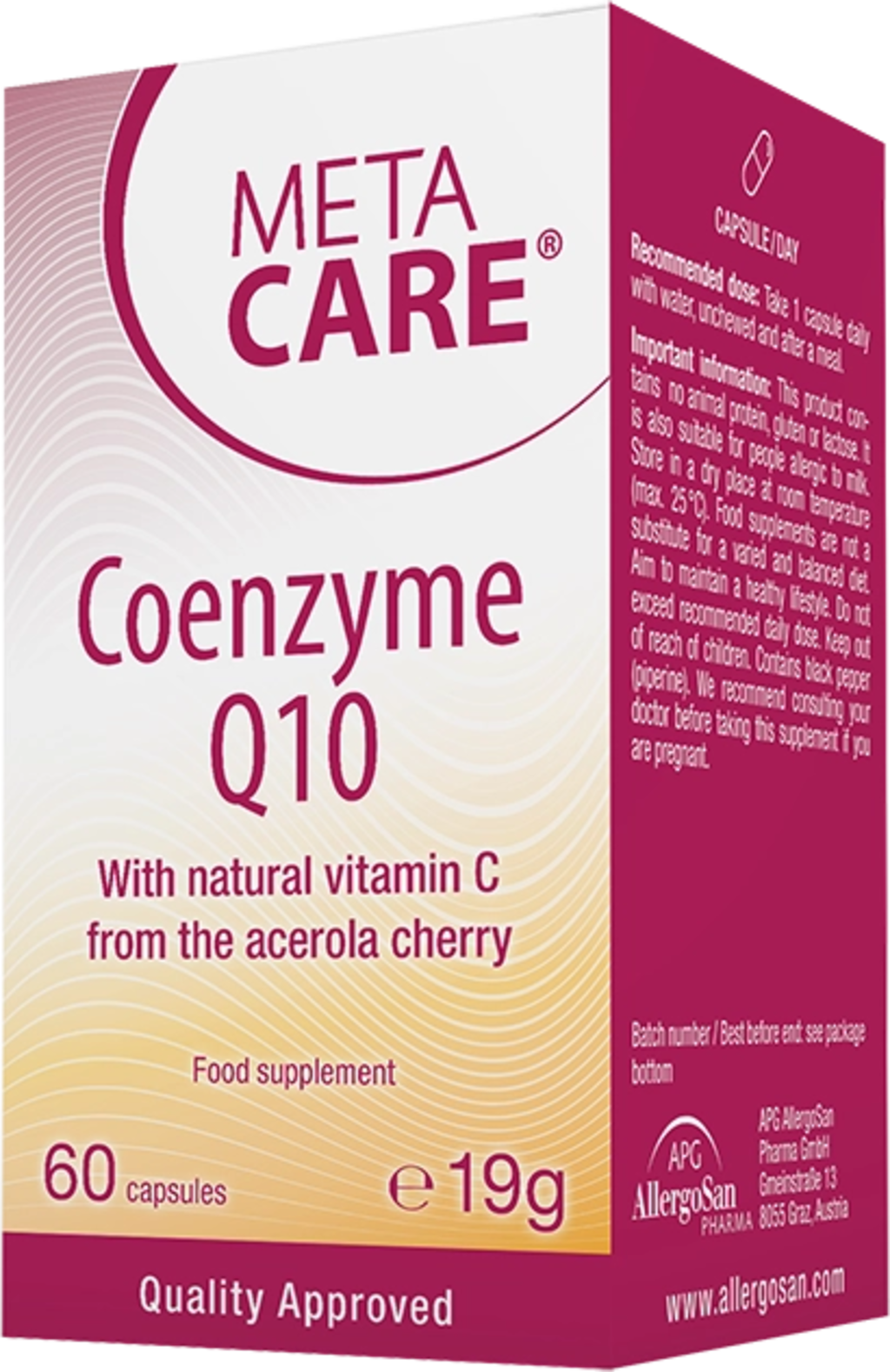META-CARE® Koentsyymi Q10 tarjoaa sinulle laadukasta koentsyymi Q10:ä kapselimuodossa. Acerolakirsikasta saatava C-vitamiini, E-vitamiini sekä kurkuma- ja mustapippuriuutteet täydentävät vegaanisen reseptin täydellisesti.