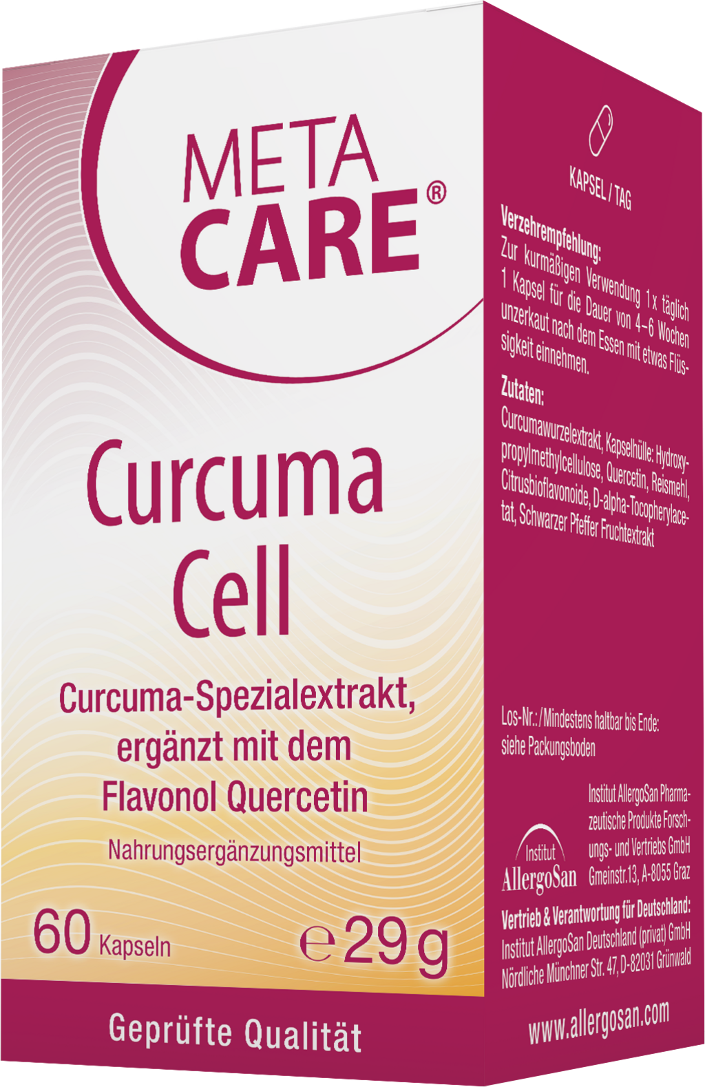 META-CARE® Curcuma Cell tarjoaa sinulle kasviperäisiä radikaalinsieppareita kapselimuodossa. Kapselit on rikastettu kurkumalla, kversetiinillä, mustapippurilla ja E-vitamiinilla. Kurkuma sisältää monia arvokkaita aineosia, kuten kurkuminoideja ja eteerisiä öljyjä. Kapselien koostumus on täysin vegaaninen ja geenimuuntelematon.