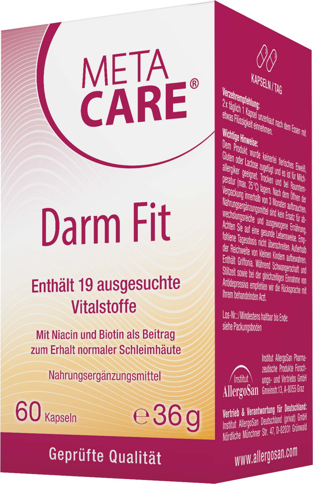 META-CARE® Darm Fit on suoliston hyvinvointiin kehitetty ravinnekompleksi, joka sisältää runsaasti vitamiineja ja kivennäisaineita. Kapselit sisältävät muun muassa C-, D3-, E-, B1- ja B12-vitamiineja sekä foolihappoa, biotiinia, niasiinia, magnesiumia, sinkkiä ja seleeniä. Ne on lisäksi rikastettu korkealaatuisella griffonian siemenuutteella. Kapselit ovat kasvisyöjäystävällisiä ja geenimuuntelemattomia.