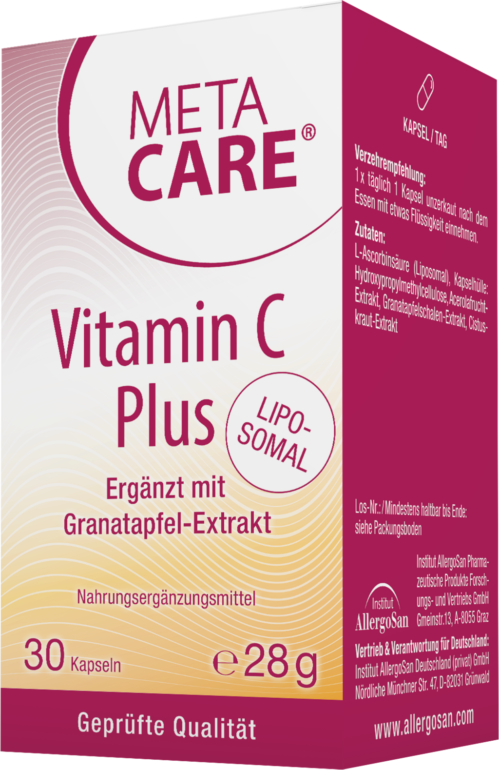 META-CARE® Vitamin C Plus -kapselit sisältävät acerolakirsikkauutetta, granaattiomenankuoriuutetta ja cistus-yrttiuutetta. C-vitamiinia ympäröi liposomaalinen fosfolipidikerros, joka suojaa sitä mahanesteeltä.