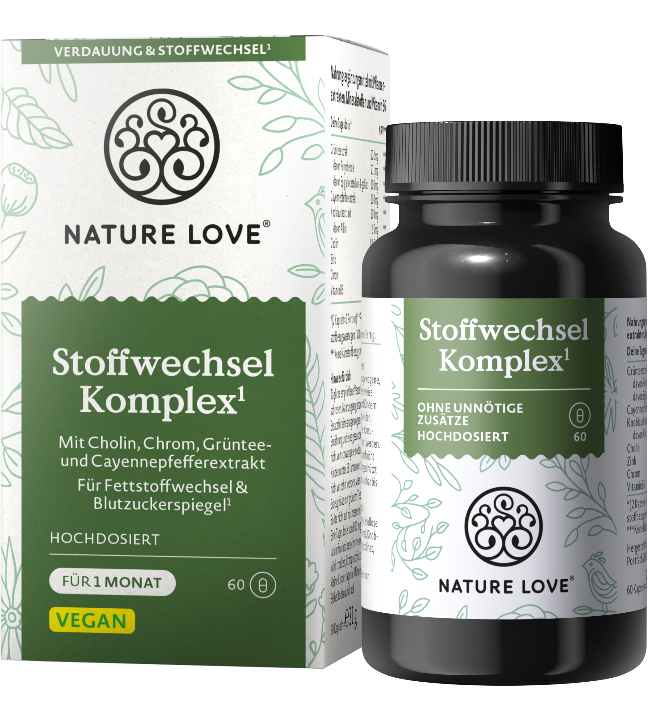 Nature Loven Aineenvaihduntakompleksi-kapselit sisältävät sekoituksen vihreää teetä, cayennepippuria, valkosipulia, sinkkiä, kromia, koliinia ja B6-vitamiinia. Ei sisällä lisäkofeiinia, jotta vältetään lyhytaikaiset kofeiinista johtuvat energiapuuskat. Täysin vegaaninen ja täydellinen tuki arkeesi.