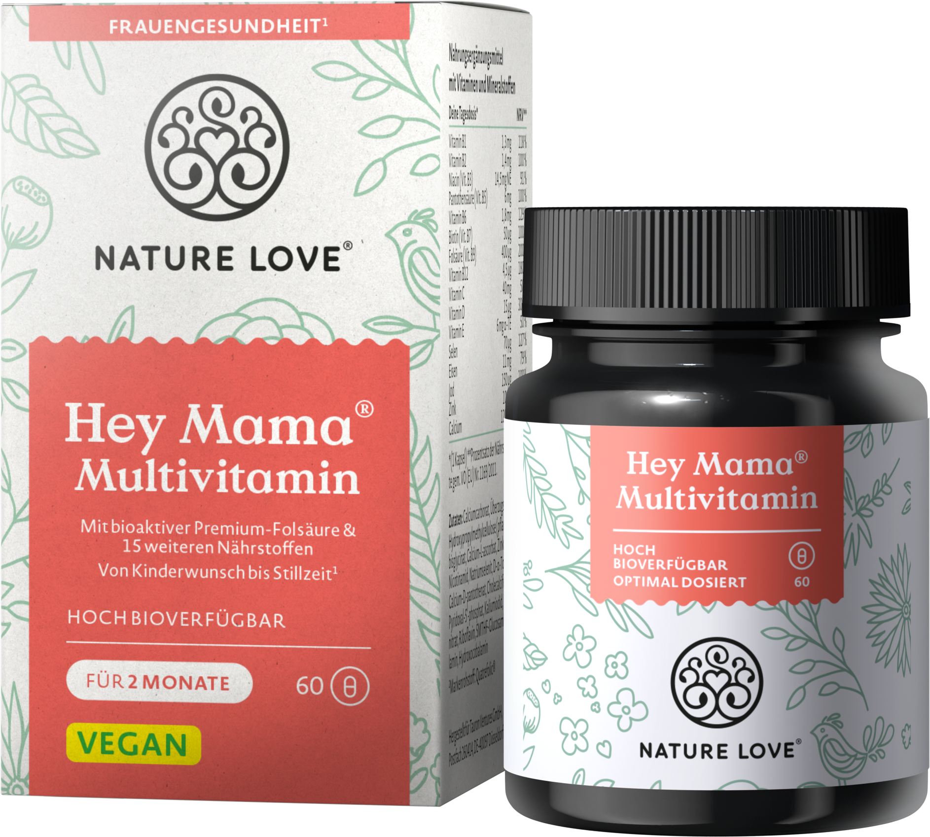 Nature Loven Hey Mama -multivitamiinikapselit tukevat sinua suunnitellessasi raskautta tai imettäessäsi. Kapselit on rikastettu monilla laadukkailla ravintoaineilla, jotta saat parasta mahdollista tukea tähän jännittävään aikaan. Nature Love yhdistää muun muassa premium-foolihapon, jodin, sinkin, B6-vitamiinin, B12-vitamiinin ja raudan. Kapselit ovat vegaanisia ja optimaalisesti annosteltuja.