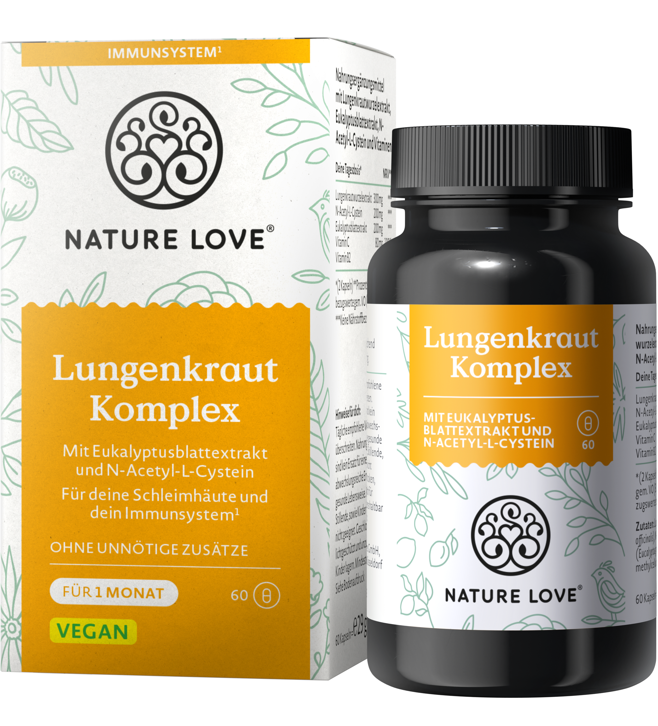 Nature Love käyttää Keuhkoruohokompleksissa laadukkaita keuhkoruohojuuren ja eukalyptuslehtien uutteita. Lisäksi kapselit on rikastettu C-vitamiinilla, NAC:lla (N-asetyyli-L-kysteiini) ja riboflaviinilla, jotta ne tarjoaisivat kehollesi mahdollisimman kokonaisvaltaista tukea. Kapselit ovat täysin vegaanisia ja gluteenittomia eivätkä sisällä tarpeettomia lisäaineita.