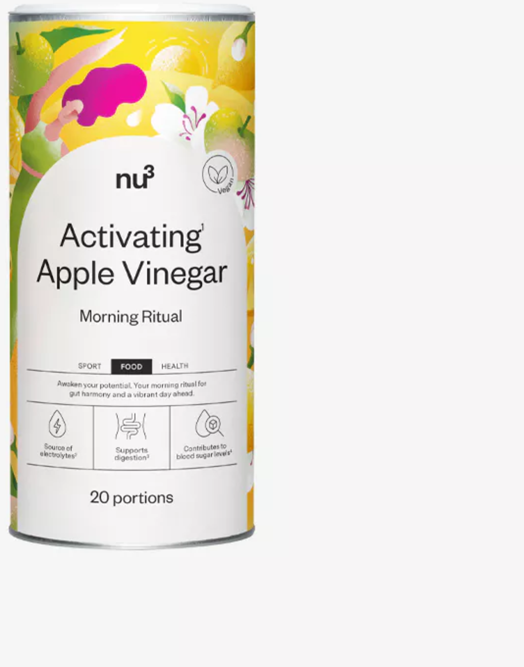 Koe omenaviinietikka uudessa muodossa: nu3 Activating¹ Apple Vinegar yhdistää omenaviinietikka-uutteen sitruunahedelmäjauheeseen, inuliiniin, L-glutamiiniin ja koliiniin. Kaavaa tukee kahdeksan valittua mikroravintoainetta, kuten kalsium, magnesium, kromi ja biotiini. Täydellinen tapa virkistää päivittäistä aamurutiiniasi.